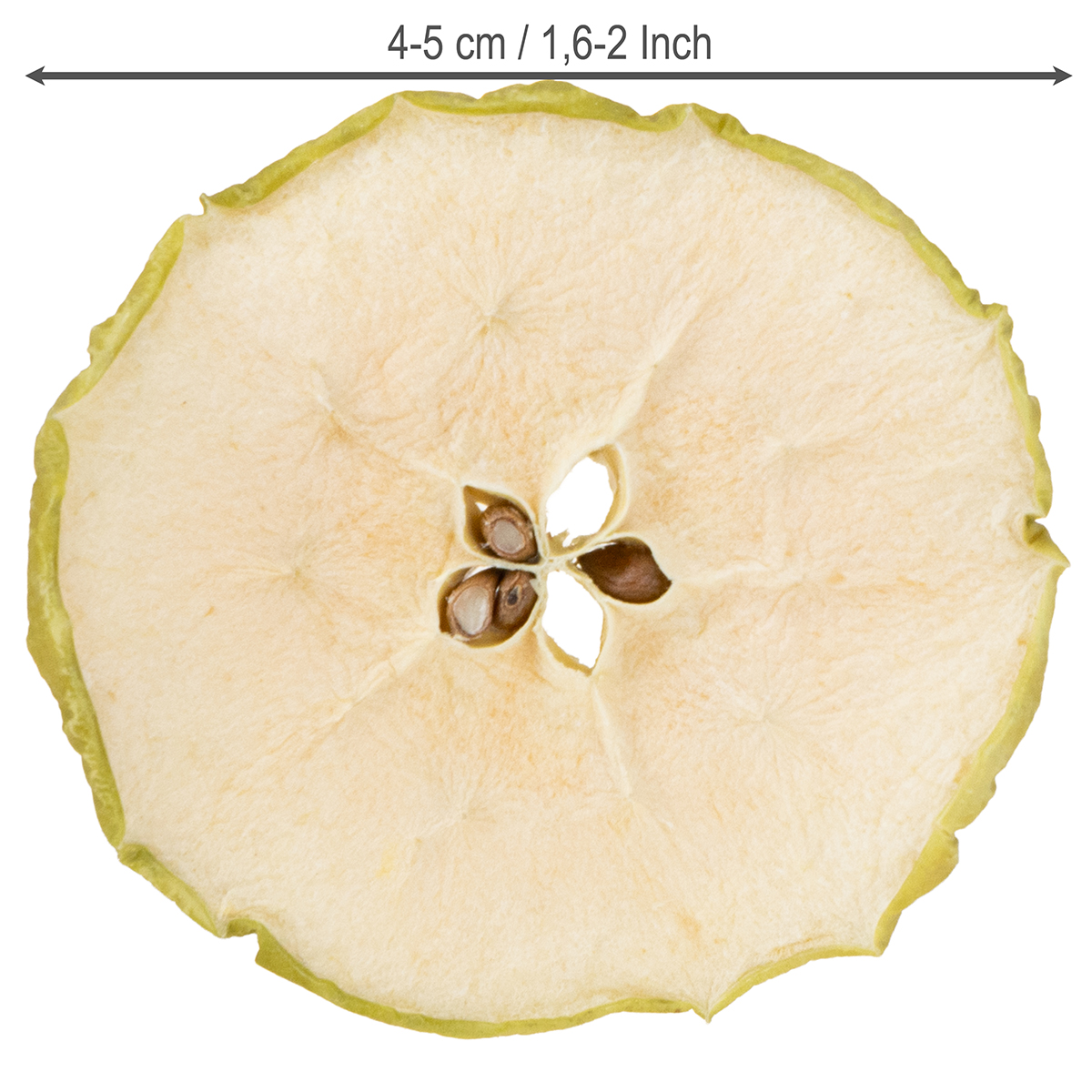 Hver pakke på 500 gram indeholder flere røde æbleskiver til dekoration, som alle er naturligt lidt forskellige størrelser. Diskene har en diameter på cirka 4 til 5 centimeter og er en ekstraordinær virkning som dekoration på bordløberen ved spisebordet, som er uden sidestykke.
