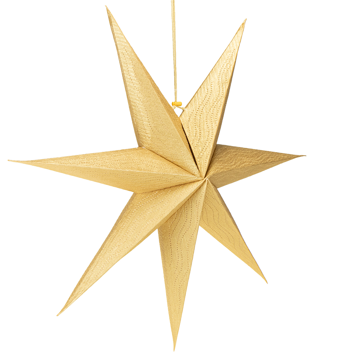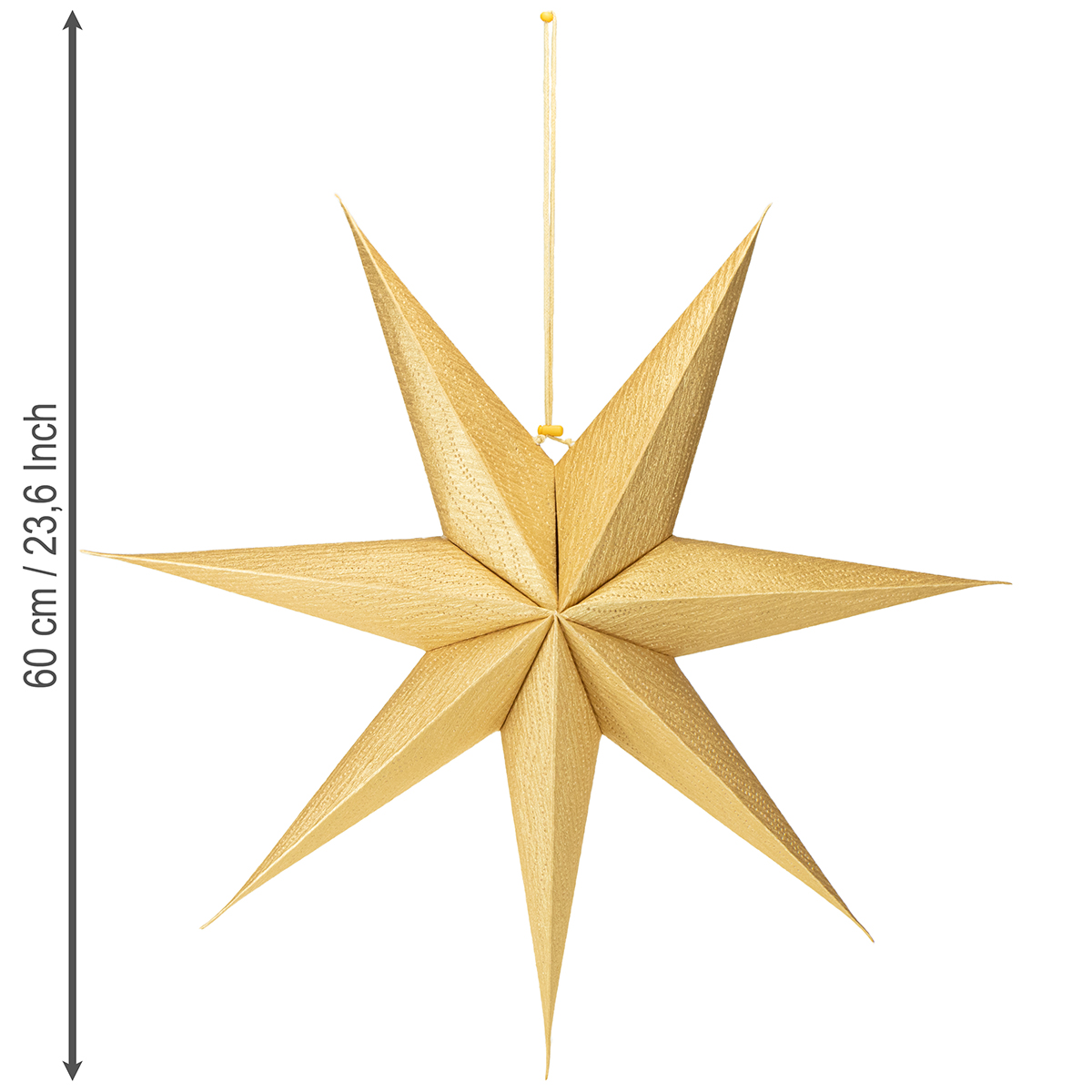 Denne papirstjerne imponerer med sin enkle, tidløse elegance. Den er delikat fremstillet af papir af høj kvalitet og har en varm guldtone, og den passer perfekt ind i en række forskellige indretningsstile. Materialet har en naturlig charme, samtidig med at det forbliver robust nok til at give blændende detaljer år efter år. Med en diameter på 60 cm er stjernen stor nok til at gøre et indtryk i ethvert miljø.