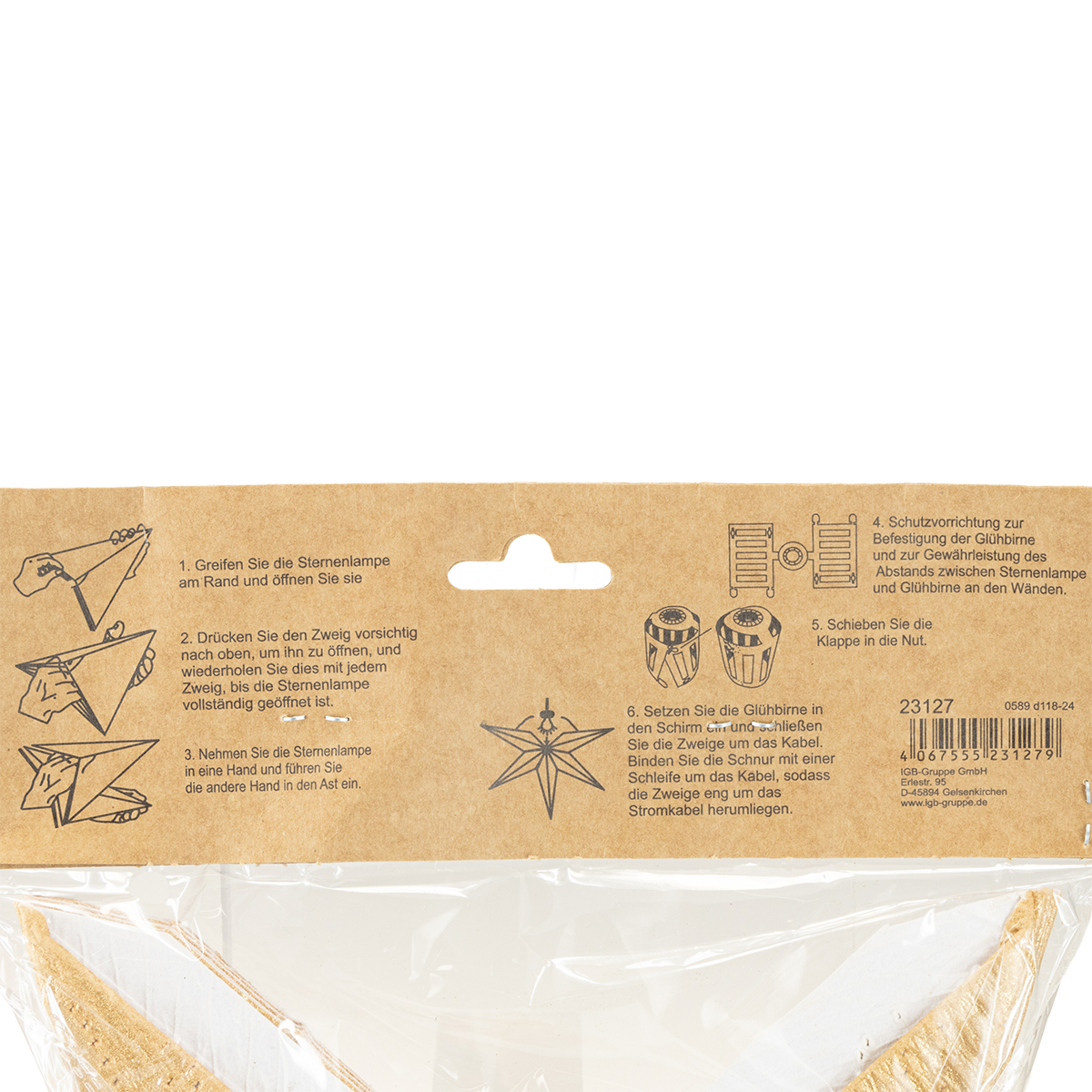 Denne julestjernes tidløse design gør den nem at kombinere med andre dekorative elementer: Pynt den med lyskæder eller hæng den blot i nærheden af stearinlys og grangrene. For dem, der foretrækker et minimalistisk look, ser stjernen også fantastisk ud alene eller mod en ensfarvet væg. Tilføj en almindelig pære eller anden lyskilde, og stjernen vil udsende et behageligt varmt skær i mørket – perfekt til at forbedre den festlige atmosfære i dit hjem. Uanset om den placeres over julebordet, midt i et vindue eller som et midtpunkt over pejsen, vil denne klassiske julestjerne helt sikkert fange alles opmærksomhed.