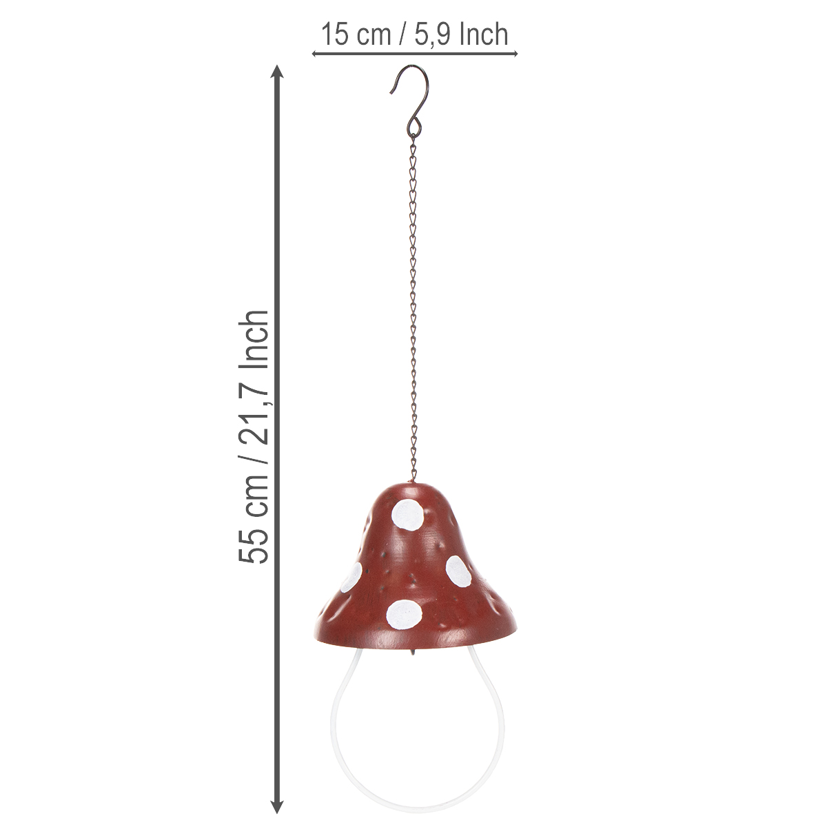 Hængende foderautomat i metal, med fluesvampemotiv, rød og hvid, 25,5 cm