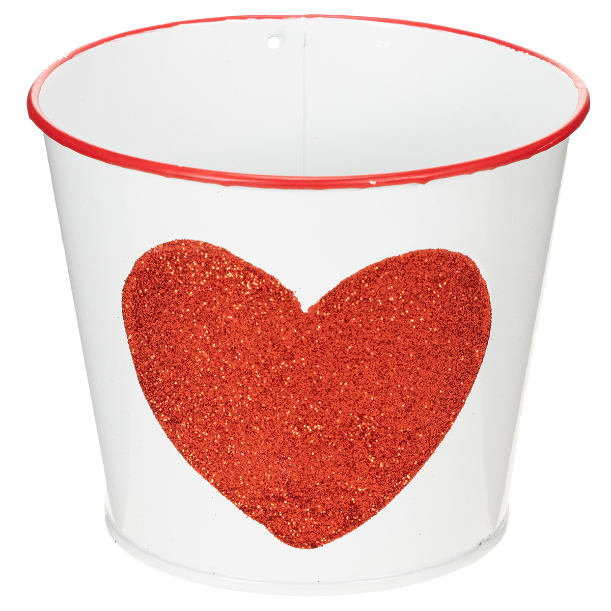 En smuk lille urtepotte med et klassisk design. Den hvide blikspand er formet som en kop, har en rød kant og en rød hjerteform.