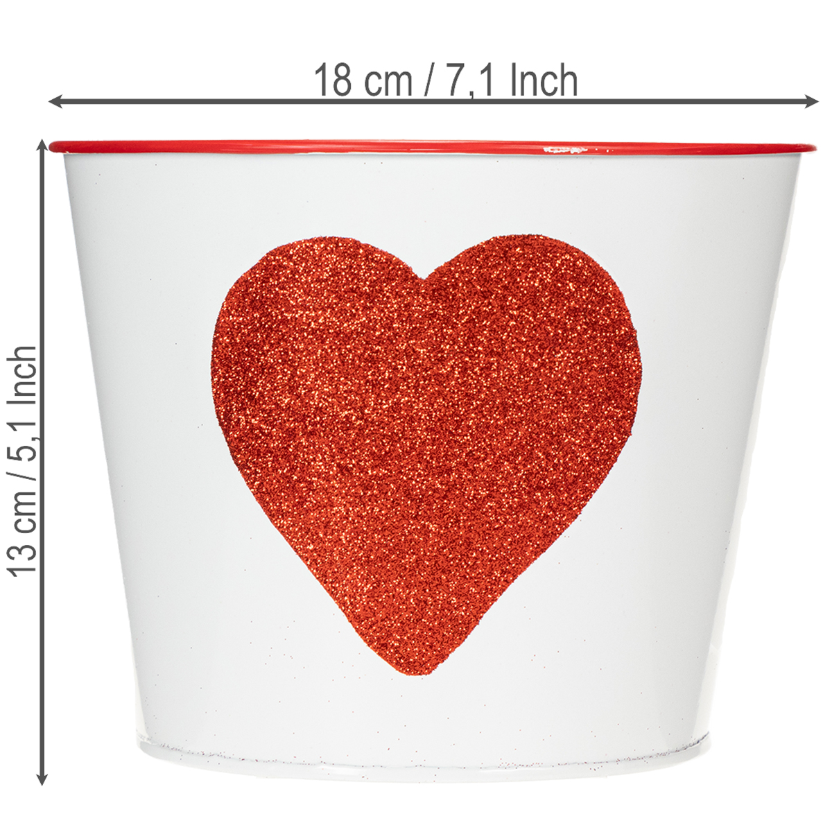 Denne urtepotte med den glitrende hjerteform er den ideelle plantekasse til at forære orkideer på Valentinsdag. Den hvide blikspand har et meget romantisk hjerte med rødt glimmer og en rød kant i midten. Med sådan et klassisk design bliver mor også glad for en plante eller blomst til mors dag.