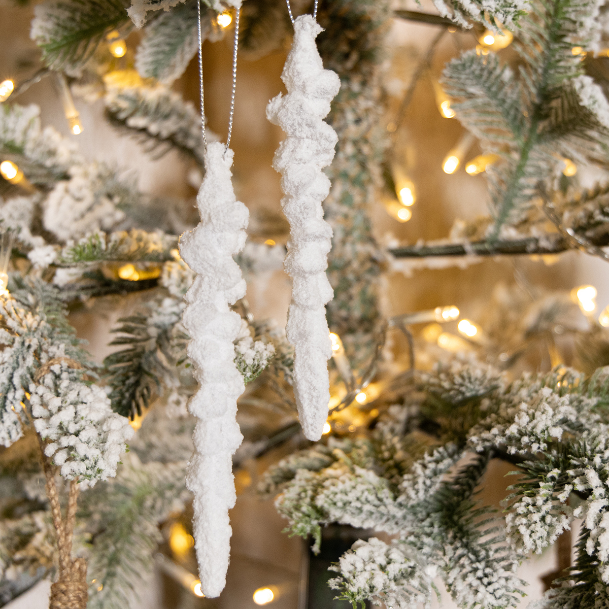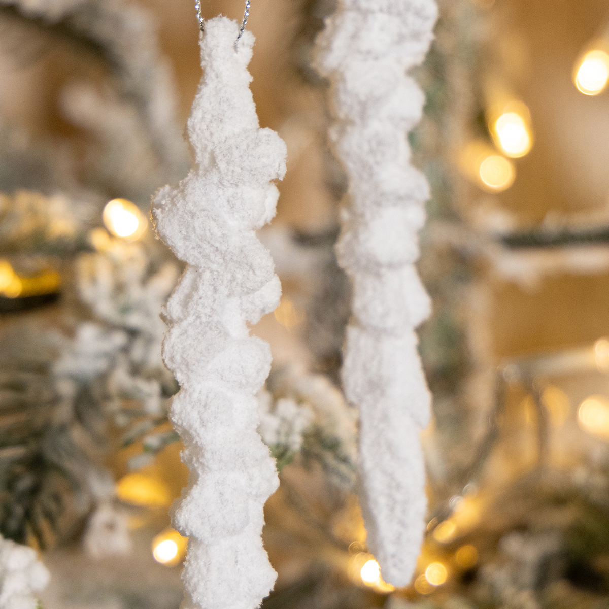 Snedækkede juletræspynt i form af istapper – hvid vintermagi til stuen