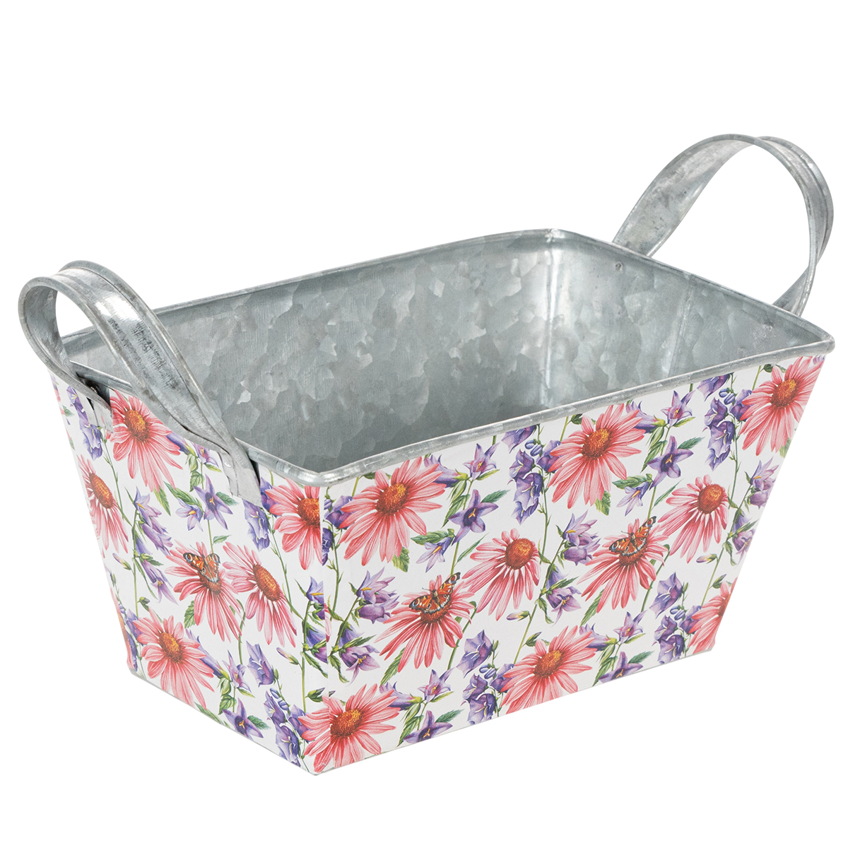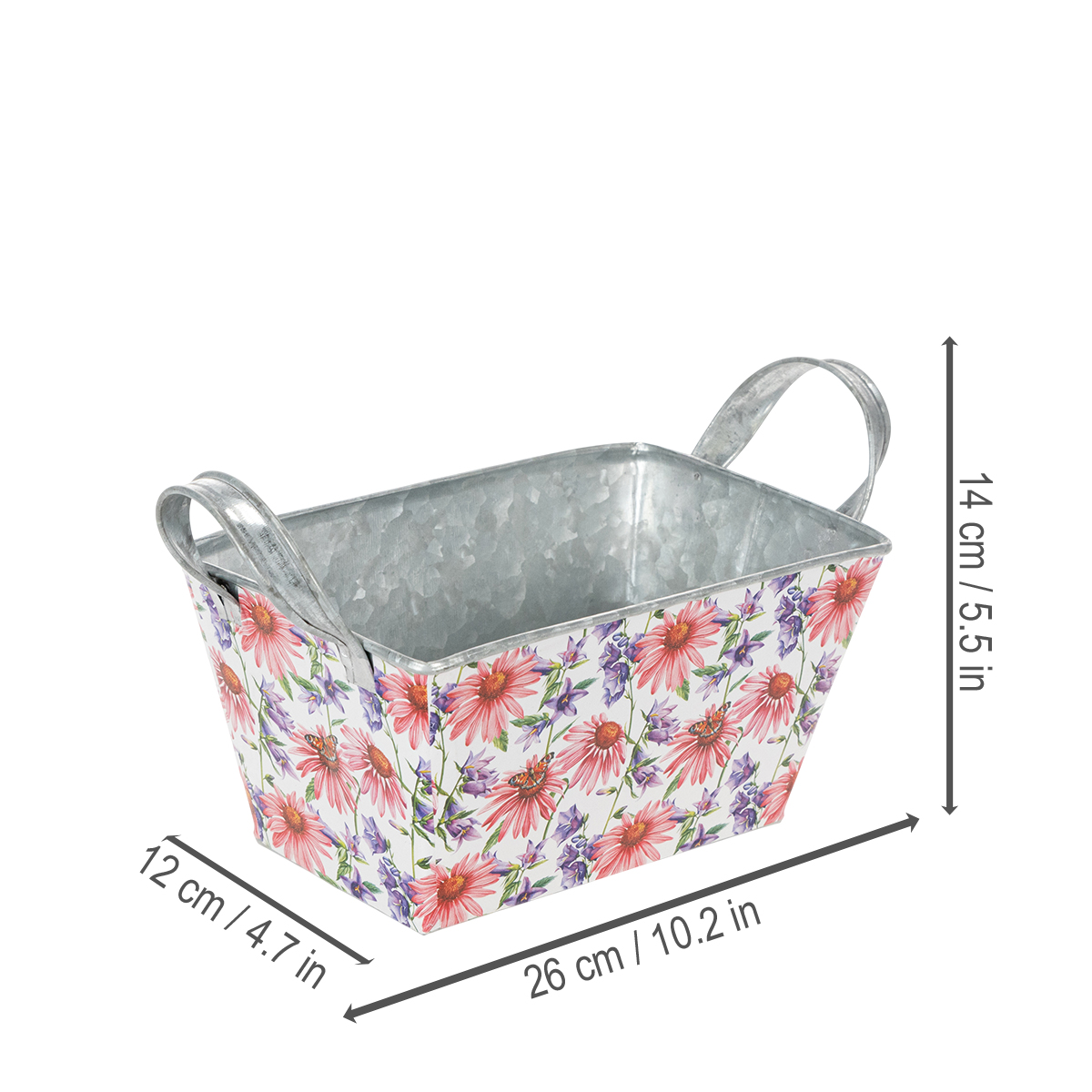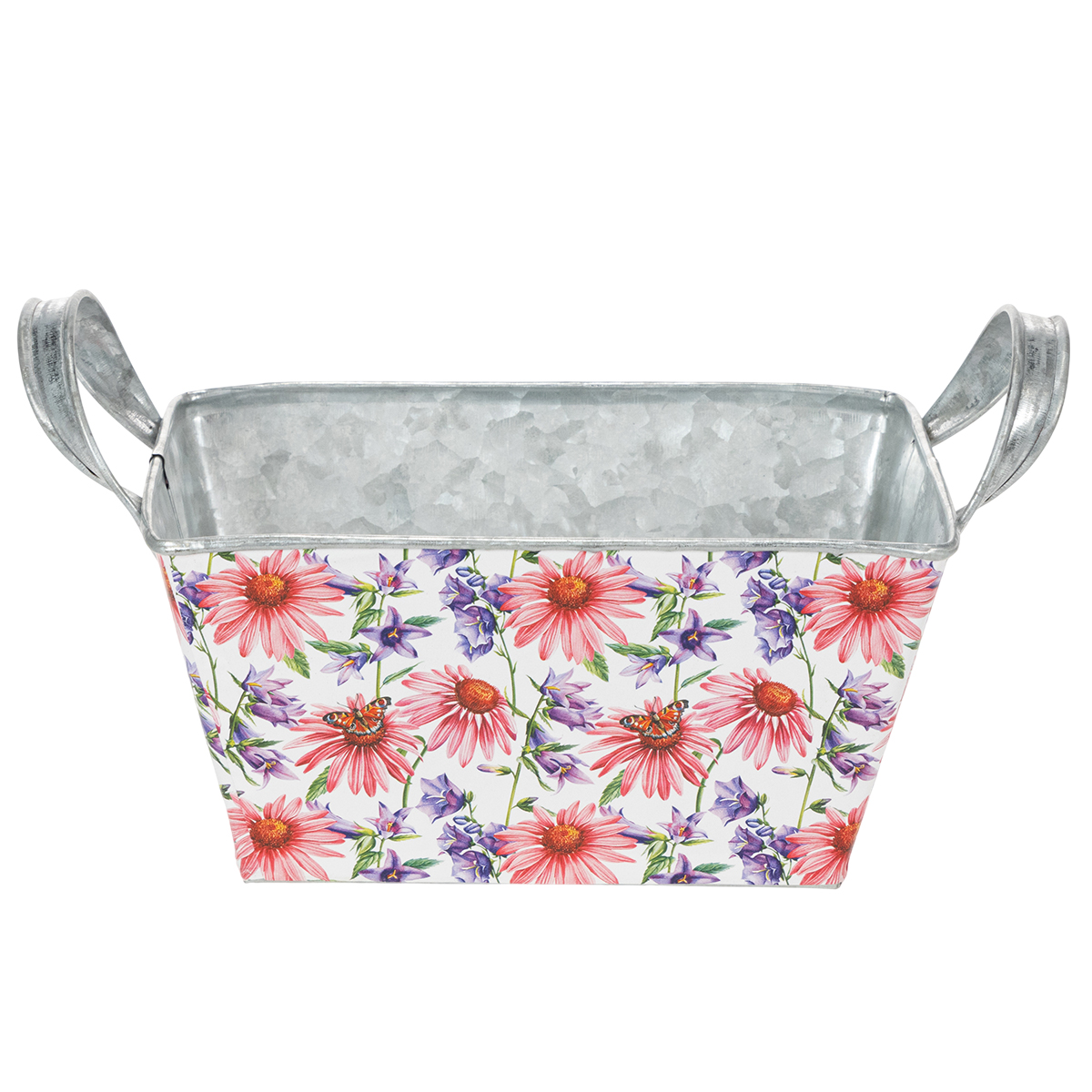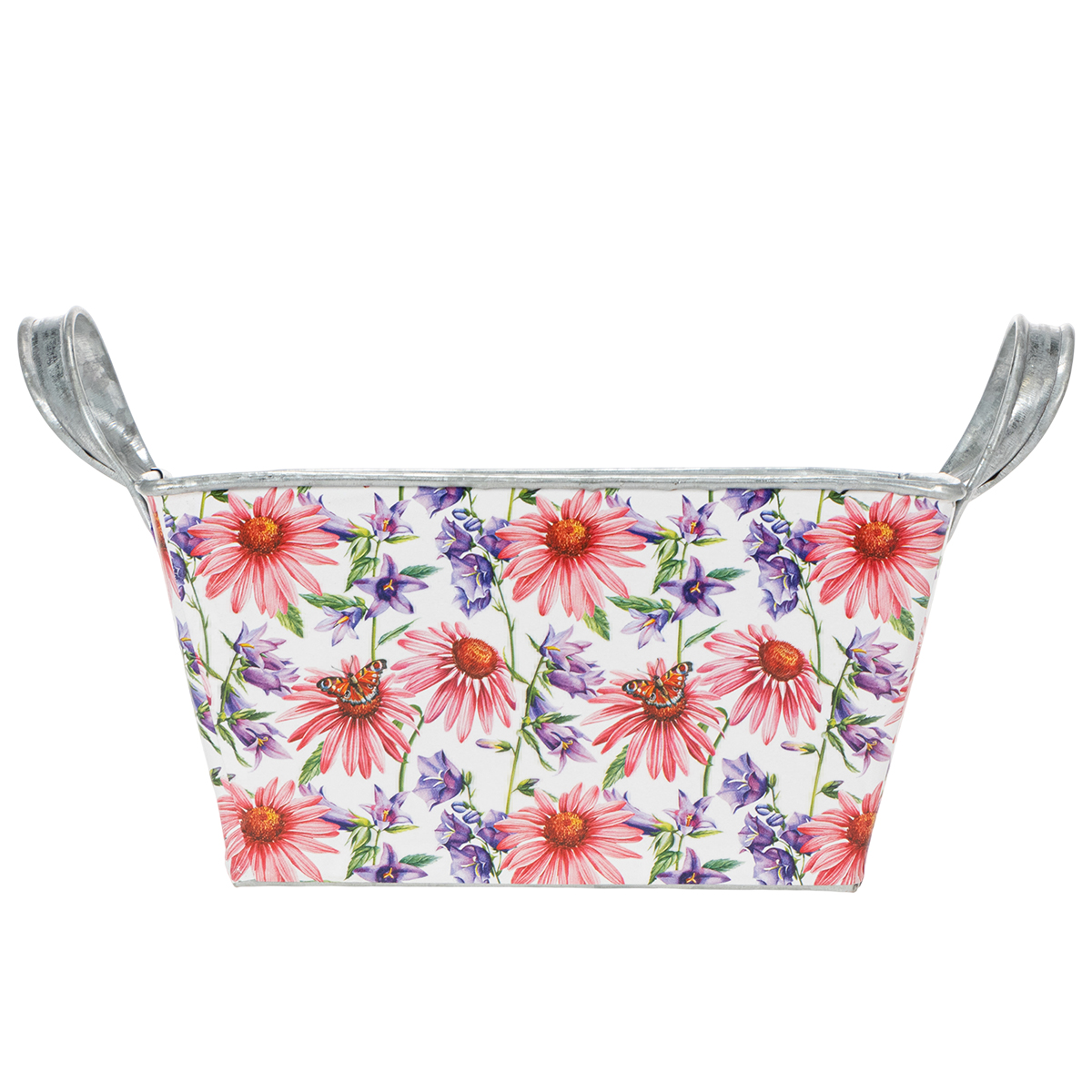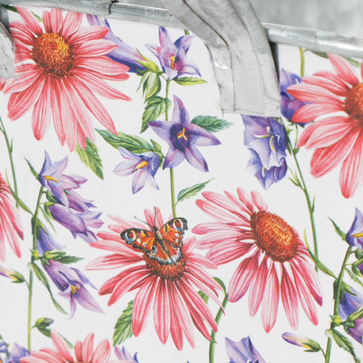Pink og lilla forårsblomster på en hvid baggrund skaber en varieret og optimistisk ramme. Blomstermotivet er trykt på en kraftig folie, som igen klæber til zinkbeholderen. På den måde danner indersiden med den sølvfarvede zink en stærk kontrast i forårsdekorationen.