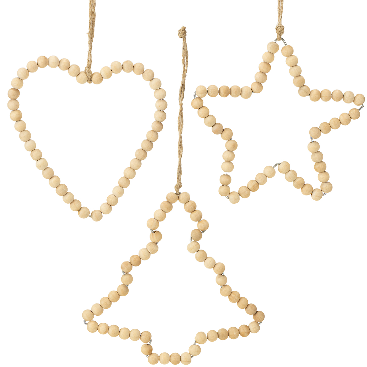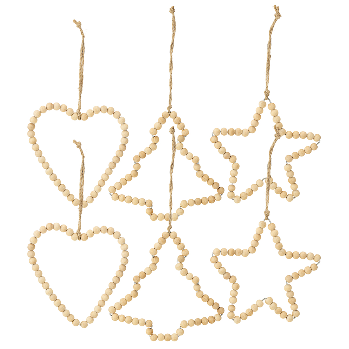 Julepynt: træperler, hjerte, stjerne, træ, 13 cm høj, 6 stk.
