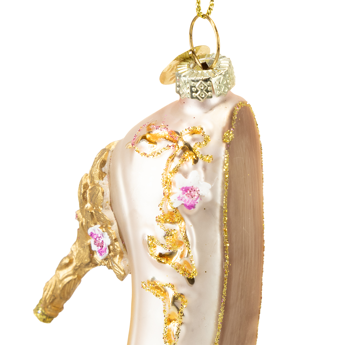 Enhver juletræspynt har en særlig historie – og disse smukke glassko er ingen undtagelse! Deres fine detaljer, såsom kunstfærdigt skulpturerede gyldne blomsterdekorationer, gør dem virkelig specielle. Deres ophængningsløkke gør dem nemme at fastgøre til grene, guirlander eller endda dekorative kviste i en vase. Den fine rosafarvede overflade har en behagelig satinfinish, som kombineret med guldet skaber et festligt og harmonisk farveskema. Plastikhælene giver skoene ekstra stabilitet uden at forringe det elegante helhedsindtryk.