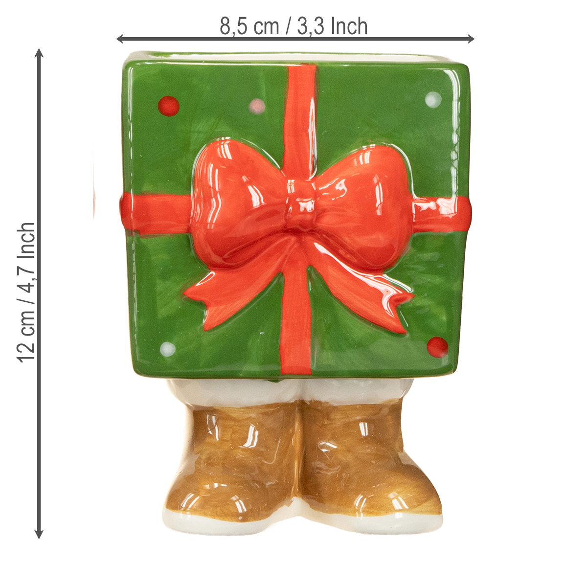 Original julepynt med et særligt præg – i dette tilfælde med fødder: Lad dig fortrylle af denne julepotte i keramik! Disse charmerende gaveæske med fødder og en stor rød sløjfe hører simpelthen hjemme på ethvert bord i adventstiden – eller i vindueskarmen. Uanset om det er i stuen, på bordet eller som et originalt blikfang på kontoret: disse små kunstværker fremkalder en varm og festlig atmosfære i ethvert julemiljø.