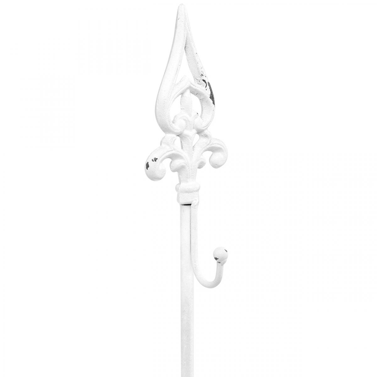 Kranseholderen i hvidt bringer shabby chic til dine dekorative kranse! Støbejerns metaldekorationen har en tung base, så stativet ikke vælter, en sidekrog til ophængning af kransen og en spids i en stiliseret liljeform. Metalstanderen blev først malet brun, derefter hvid. Endelig blev den hvide maling på kransestativet fjernet nogle steder, hvilket giver pyntestativet sit typiske vintage -look.