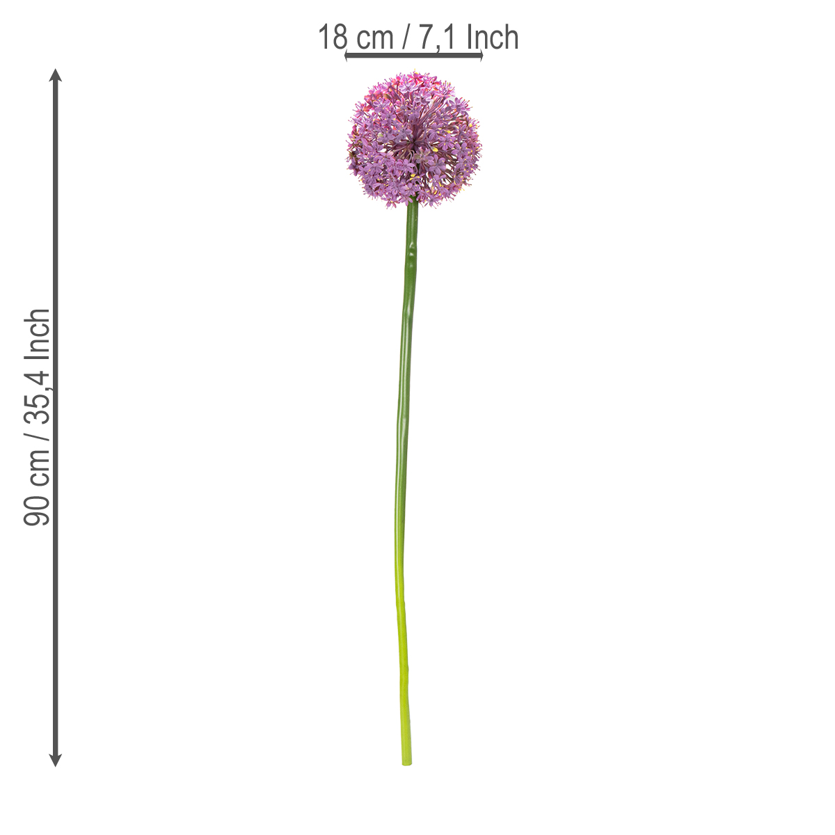 Leder du efter et ægte blikfang til din stue eller arbejdsplads? Så vil du elske vores kunstige Allium-blomst! Denne dekorative blomst kombinerer ren elegance med tidløs skønhed og tilføjer et strejf af stil til ethvert rum. Med en højde på imponerende 90 cm skaber den et slående indtryk på skænke, borde eller i høje vaser. Det sfæriske, lilla-farvede blomsterhoved er særligt iøjnefaldende, fremstår utroligt realistisk og kan prale af omhyggelige detaljer. Den er lavet af polyester og plastik af høj kvalitet og er bygget til at holde, hvilket gør denne prydblomst til et pålideligt dekorativt element.