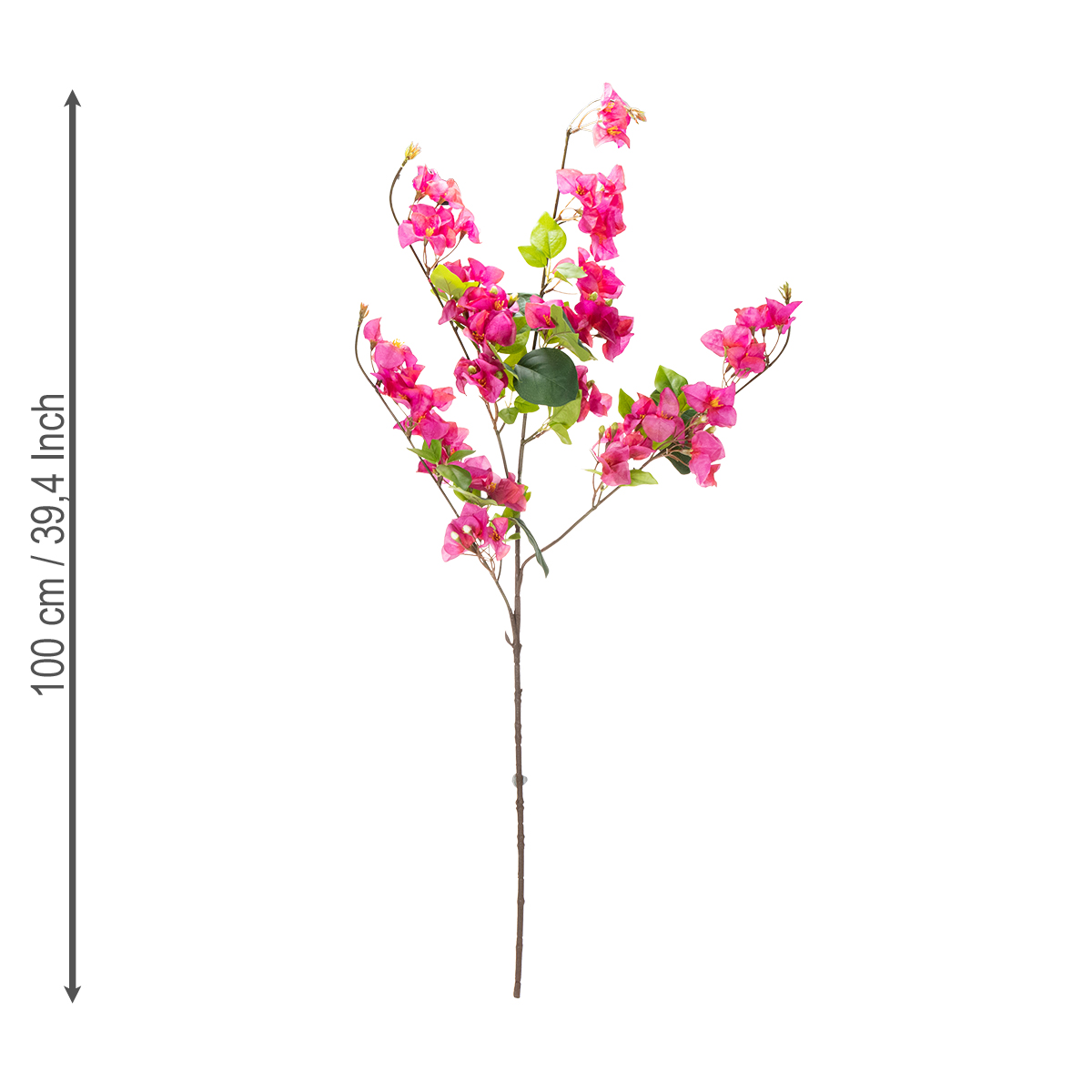 Med sin elegante højde på 100 cm er denne dekorative gren perfekt til høje vaser eller som en del af et frodigt arrangement. Uanset om den vises individuelt eller kombineres med andre kunstige planter såsom palmer eller bregner, passer denne bougainvillea-gren smukt ind i enhver indretningsidé. Den er et særligt populært højdepunkt til begivenheder som bryllupper, havefester eller andre særlige lejligheder. Enhver, der elsker middelhavs- eller tropiske præg, vil blive begejstret for denne gren!