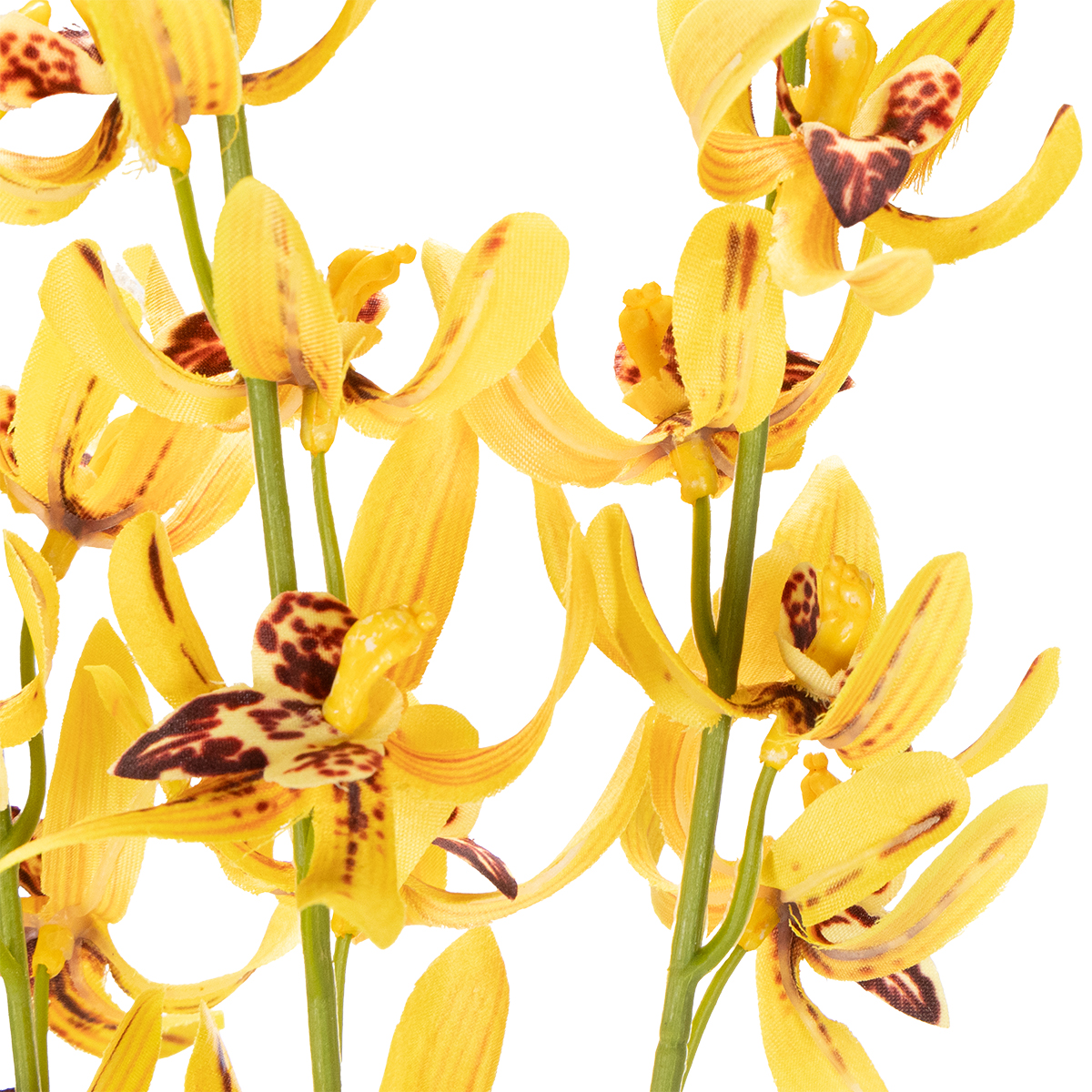 Cymbidium-orkideen betragtes som et symbol på elegance og sofistikering. Takket være dens høje kvalitet i håndværk er den praktisk talt uforgængelig, men alligevel et sandt blikfang. Kombinationen af gult silkestof, der giver en autentisk fornemmelse, og en fleksibel plaststilk gør den ikke kun visuelt tiltalende, men også praktisk til dine kreative projekter. Brug den til at dekorere store vaser, eller kombiner orkideen med grønne grene og andre kunstige blomster for imponerende arrangementer.