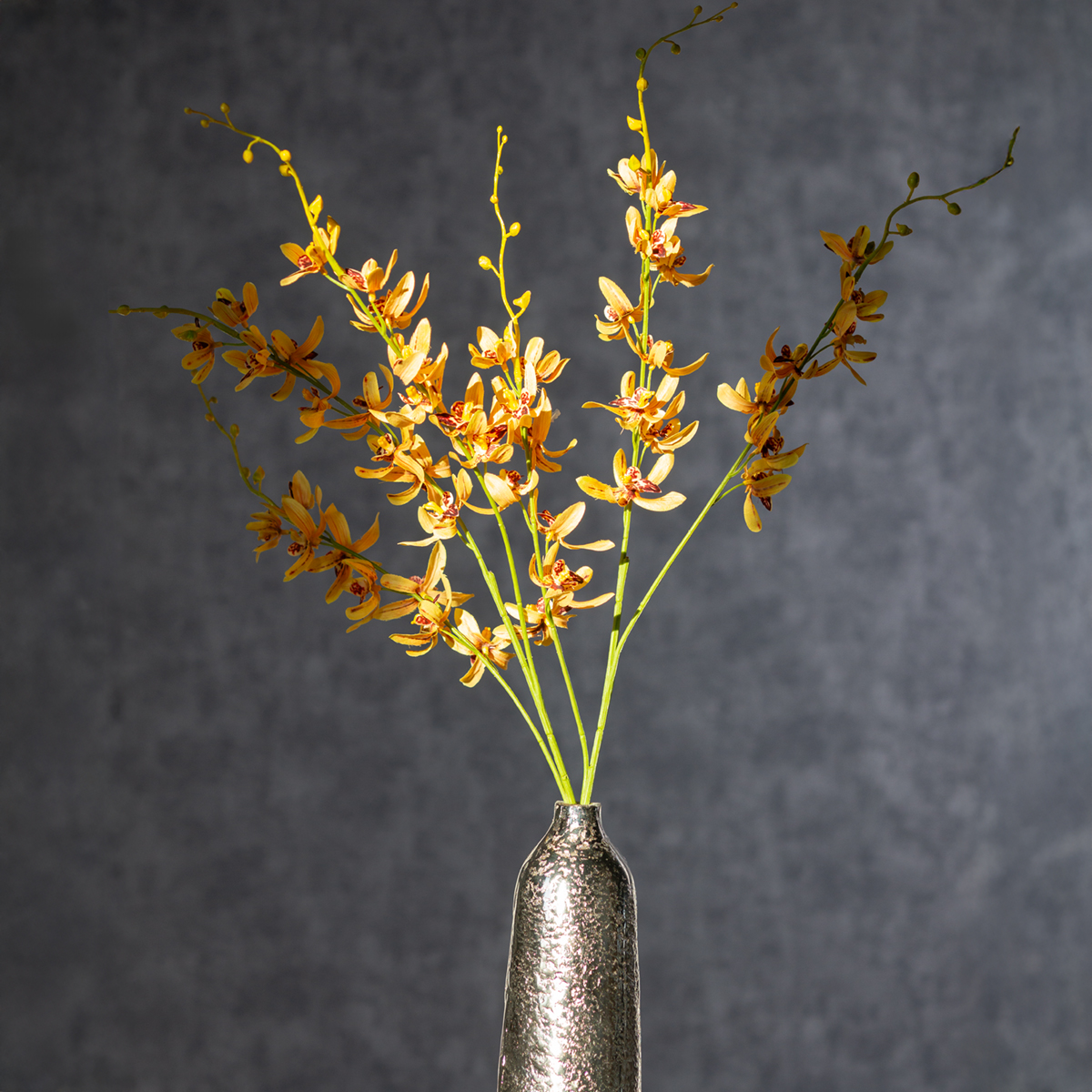 Cymbidium-orkideen betragtes som et symbol på elegance og sofistikering. Takket være dens høje kvalitet i håndværk er den praktisk talt uforgængelig, men alligevel et sandt blikfang. Kombinationen af gult silkestof, der giver en autentisk fornemmelse, og en fleksibel plaststilk gør den ikke kun visuelt tiltalende, men også praktisk til dine kreative projekter. Brug den til at dekorere store vaser, eller kombiner orkideen med grønne grene og andre kunstige blomster for imponerende arrangementer.