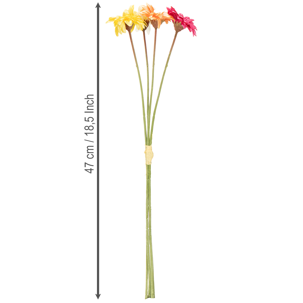 Livlige gerberaer i varig skønhed – hvem siger, at kun rigtige blomster kan imponere? Med vores kunstige gerberabuket kan du forvandle ethvert rum til en farverig oase uden at skulle bekymre dig om vand, lys eller vedligeholdelse. Uanset om det er i stuen, i vindueskarmen eller som højdepunktet på dit bryllup – disse storslåede blomster ser fantastiske ud overalt! Helt ærligt, har du ikke altid ønsket dig en buket, der altid ser frisk ud? Det alsidige farveskema er særligt praktisk: hver gerbera fås i elegant gul, munter orange, delikat hvid eller livlig pink. Sammen skaber de et harmonisk helhedsindtryk, der integreres ubesværet i enhver indretningsstil, fra moderne til landlig. Og med en længde på 47 cm er buketten ideel til alle typer vaser. Lad din kreativitet få frit løb, og skab et hjem, der vil inspirere, med disse ekstraordinære blomster!