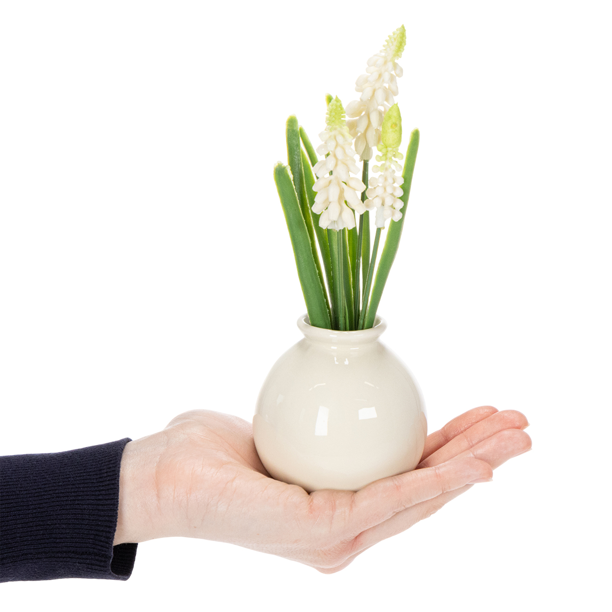 Denne kunstige hyacintvase er mere end bare en dekoration. Den fortæller en historie om smag, stil og sans for detaljer. De hvide kunstige blomster symboliserer renhed og elegance – et vidunderligt valg til forårsdekorationer, festlige borddækninger eller som gave til særlige lejligheder. Med en højde på 20 cm og en diameter på 7 cm passer den perfekt på ethvert bord, i vindueskarmen eller endda på et skrivebord på kontoret. Plastikblomsterne af høj kvalitet ser utroligt realistiske ud, og den cremehvide keramikvase giver ensemblet et tidløst og moderne look.