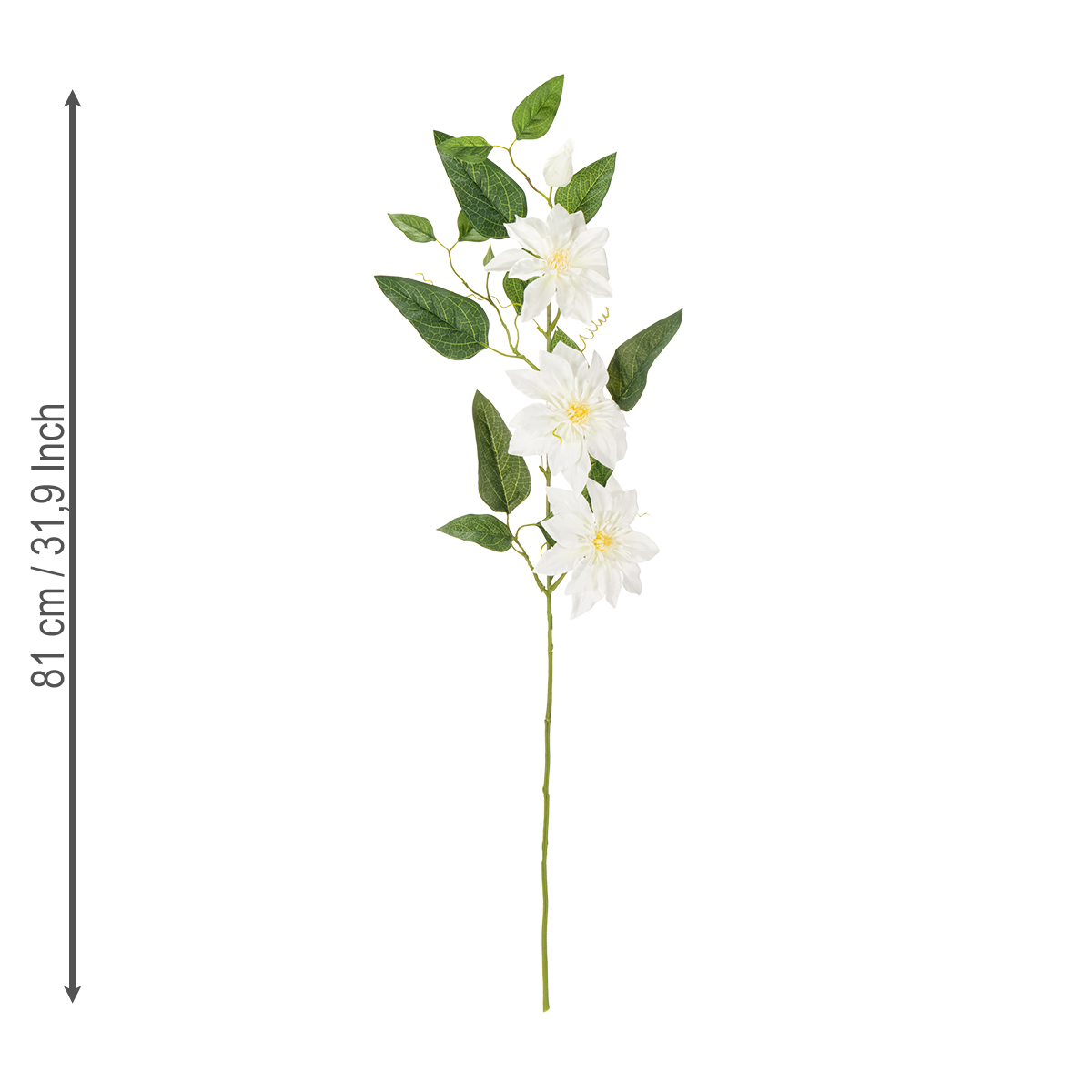 Den imponerende længde på 81 cm giver dig friheden til at arrangere grenen i både høje og lave vaser. En gulv- eller bordvase vil øjeblikkeligt blive et blikfang. Klematisgrenen er særligt velegnet til lyse, luftige rum eller som et dekorativt element til bryllupsborde, receptionsområder eller stilfulde kontorarrangementer. Hvis det ønskes, kan den også kombineres med andre transparente eller hvide dekorative blomster for at skabe et unikt blomsterarrangement. Hvad med for eksempel at tilføje et strejf af vintage ved at præsentere grenen i rustikke beholdere?