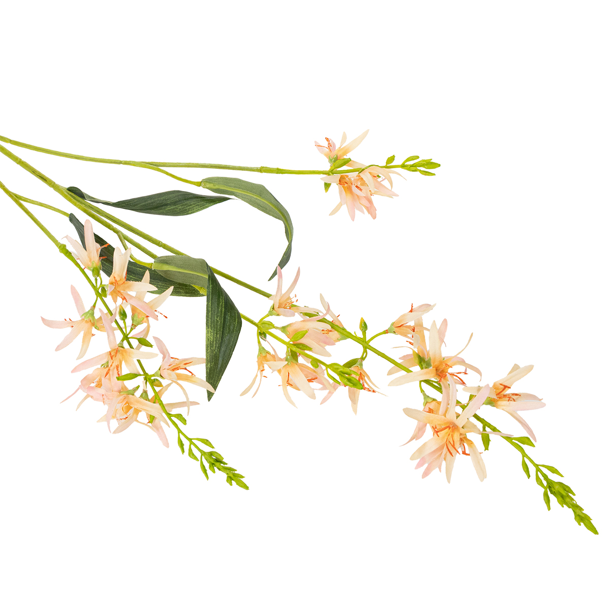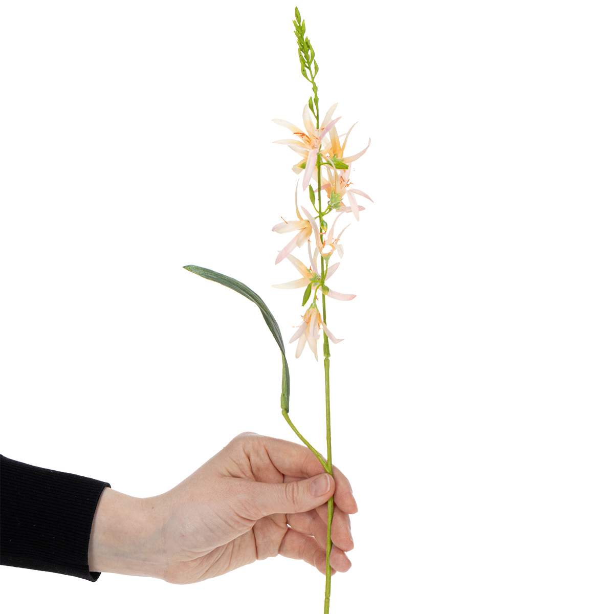 Denne kunstige lilje med lang stilk imponerer med sine materialer af polyester og plastik af høj kvalitet. Denne kombination sikrer ikke kun et realistisk udseende, men også holdbarhed. De fine detaljer i kronbladene og den naturtro farve giver liljen et charmerende, næsten vildledende ægte udseende. Den udfolder sin fulde magi, især ved bryllupper, hvor elegant design og tidløshed ønskes. Uanset om den er midtpunktet i et bordarrangement, i høje gulvvaser eller blot i en moderne vase på receptionsbordet – denne lilje er et sandt blikfang.
