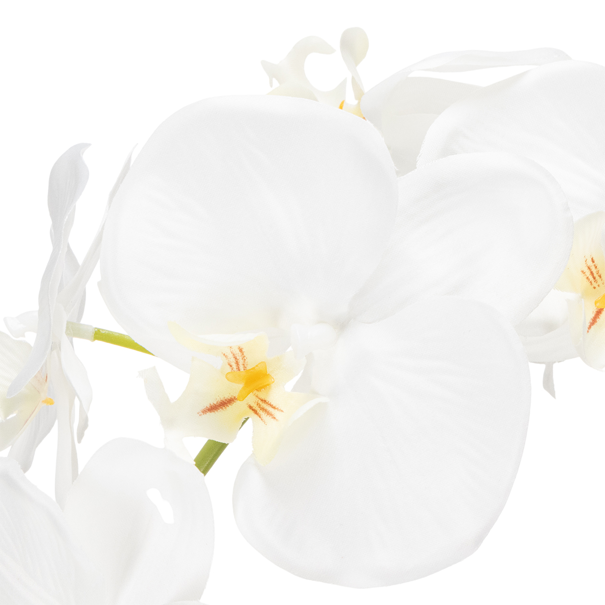 Især i stressende miljøer, såsom et kontorbord eller et mødelokale, udfolder orkideen sin særlige effekt. Dens strålende hvide farve bringer ro og harmoni til rummet, mens dens realistiske udseende bringer naturen indenfor uden behov for vanding eller placering. Uanset om den er på en hylde, i gangen eller endda på badeværelset – denne orkide tilføjer et særligt præg overalt.