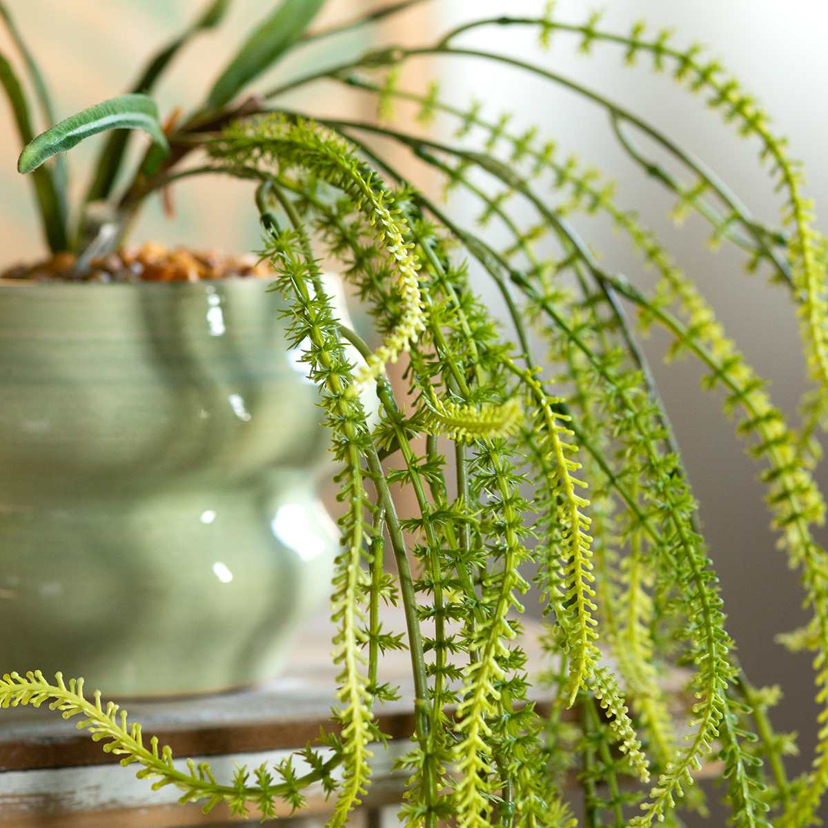 Elsker du følelsen af at fylde et rum med liv, men mangler grønne fingre? Eller leder du efter et elegant accent til bare vægge og høje lofter? Så er den kunstige plante med grønne børstehår lige det, du har brug for! Med sit naturlige udseende og en imponerende længde på 114 cm bringer denne dekorative hængeplante friskhed og elegance til dine rum, helt vedligeholdelsesfri. De kunstfærdigt udformede børstehår ser bedragerisk ægte ud, mens den smagfulde grønne farve skaber en beroligende, men levende atmosfære. Perfekt til moderne opholdsrum, begivenheder eller kontorindretning – denne kunstige plante kombinerer stil, fleksibilitet og bekvemmelighed som næsten intet andet dekorativt element. Oplev hvor nemt det er at skabe vidunderlige accenter og forbedre dit interiørdesign!