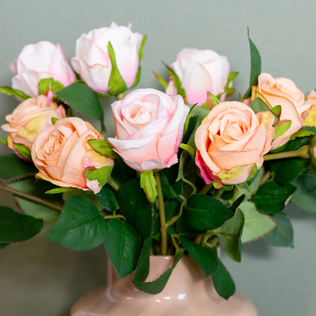 Elsker du rosernes charme, men vil du gerne undgå besværet med at passe dem? Intet problem! Med vores kunstige rosebuket kan du bringe den tidløse skønhed fra blomsterdronningen direkte ind i dit hjem. Perfekt til alle, der sætter pris på elegant dekoration uden behov for friske blomster. Uanset om den er et blikfang i stuen, en charmerende borddekoration til særlige lejligheder eller en stilfuld gave – denne rosebuket giver en særlig atmosfære til ethvert rum. De sarte lyserøde silkeblomster kombineret med grønne blade ser så utroligt realistiske ud, at du næsten glemmer, at de er kunstige. Dine gæster vil blive forbløffede!