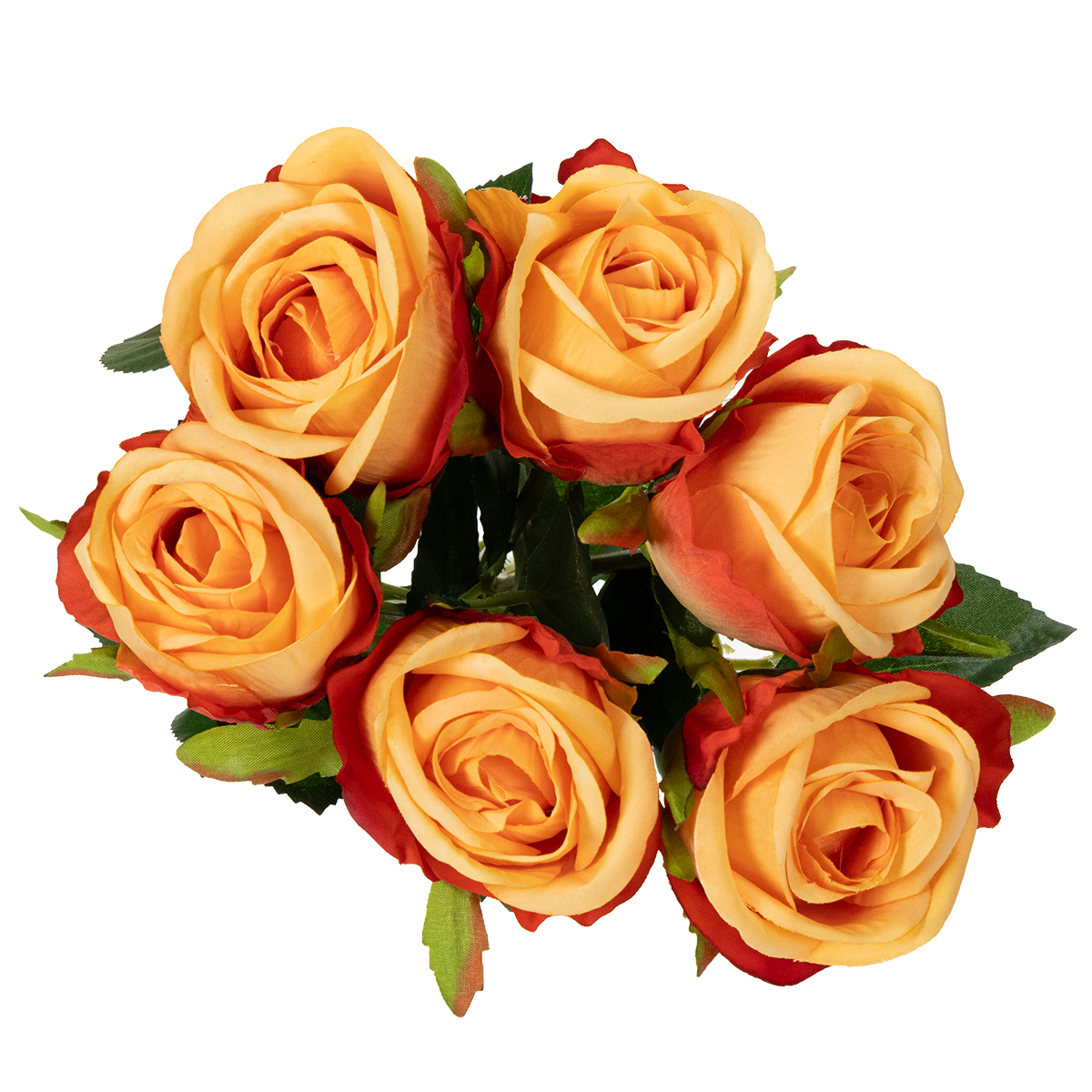 Dette kunstige rosenarrangement med sine seks orangeblomster er en sand allrounder inden for boligindretning. Med en højde på 44 cm ser det særligt elegant ud i høje vaser. Det omhyggelige håndværk med polyester og plastik af høj kvalitet giver roserne et naturligt udseende, der er overbevisende selv tæt på. Blomsternes varme orange toner bringer lethed og lysstyrke til dine rum, mens de grønne blade tilføjer et strejf af natur. Uanset om du ønsker at friske din stue op eller leder efter en stilfuld tilføjelse til dit spisebord – er denne buket et perfekt match.