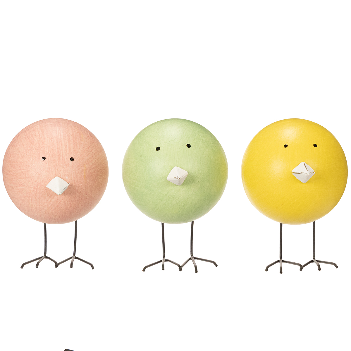 Leder du efter en smart måde at tilføje et legende og muntert præg til dit hjem? Vores runde kyllingefigurer vil øjeblikkeligt lyse ethvert rum op. Uanset om de er charmerende forårspynt på spisebordet, en farverig tilføjelse til en festlig borddækning eller et sødt blikfang på et børneværelse – disse tre små figurer i gul, pink og grøn vil med garanti bringe et smil frem på alles ansigter. Kombinationen af træ til kroppene og metal til næb og fødder giver kyllingerne en robust base og et moderne designtwist.