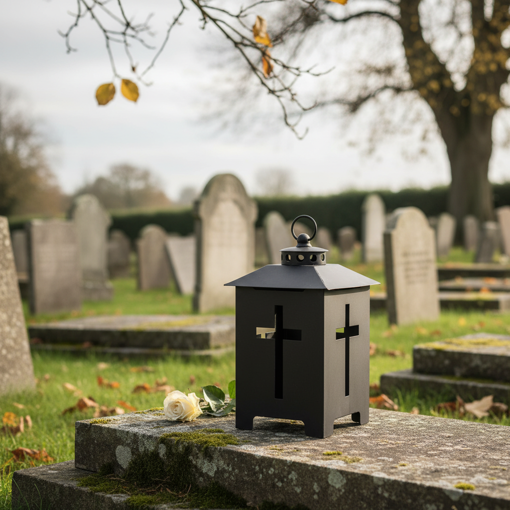 - Robust antik gravlyslanterne lavet af gråt metal for en andægtig atmosfære