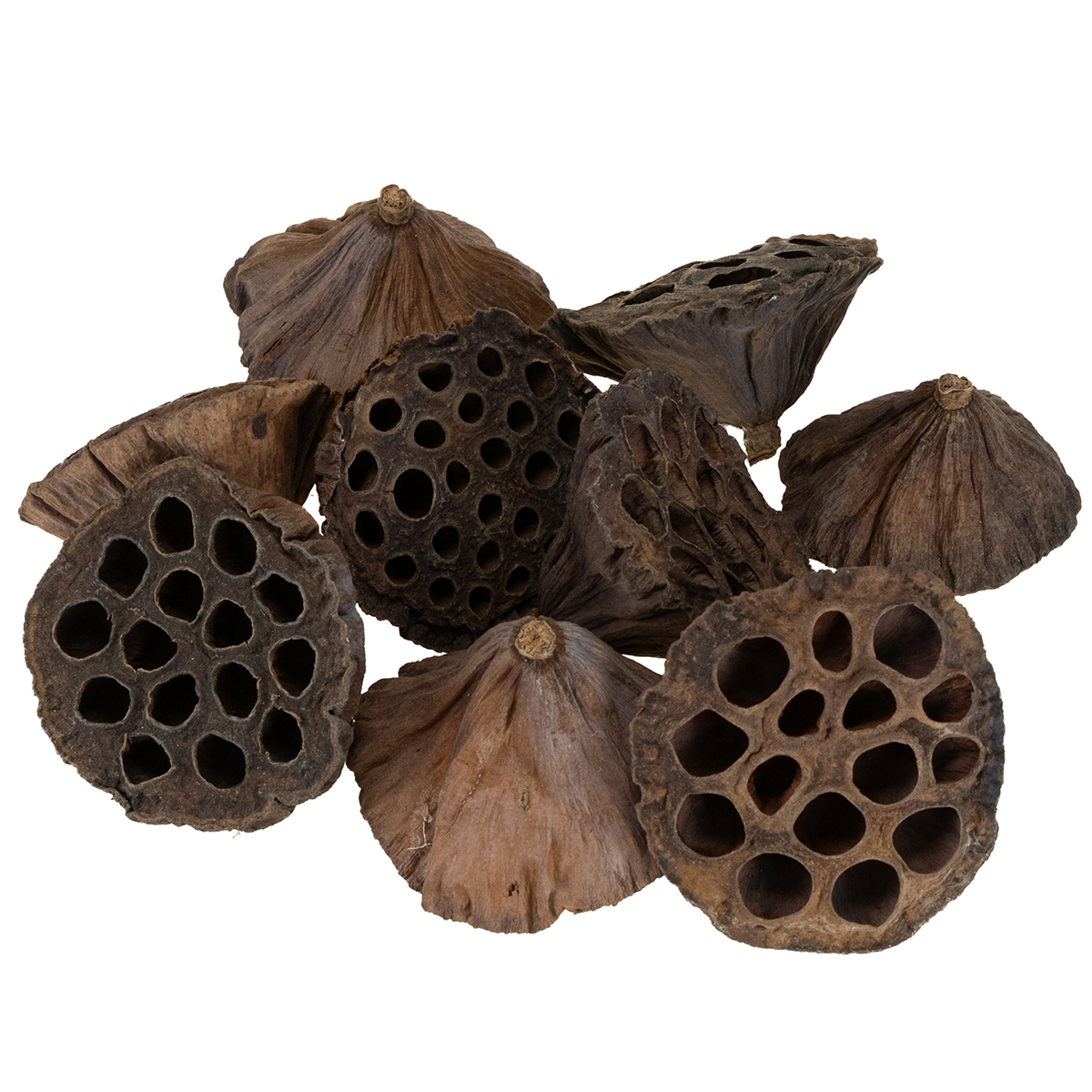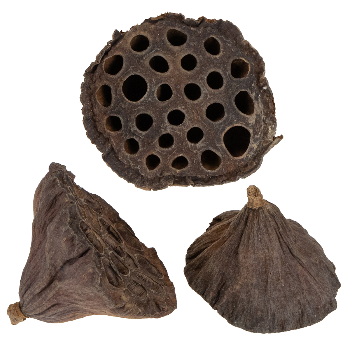 De mørkebrune tørrede frugter harmoniserer først og fremmest ufarvede eller blegede eksotiske stoffer som kokosnøddeskaller, rørkolber, klokke kopper og proteiner samt lokale naturlige produkter som kegler, spidskort og træsvampe. Du kan arrangere sådanne produkter vidunderligt på en halvcirkel lavet af plug-in masse og tilføje stilfulde figurer, symboler og et fint sorgbånd til et rundt helhedsbillede. Derudover går lotusekapslerne også meget godt med en naturlig og temmelig rustik julepynt og kan blandt andet integreres i adventskransen eller julebordarrangementet.