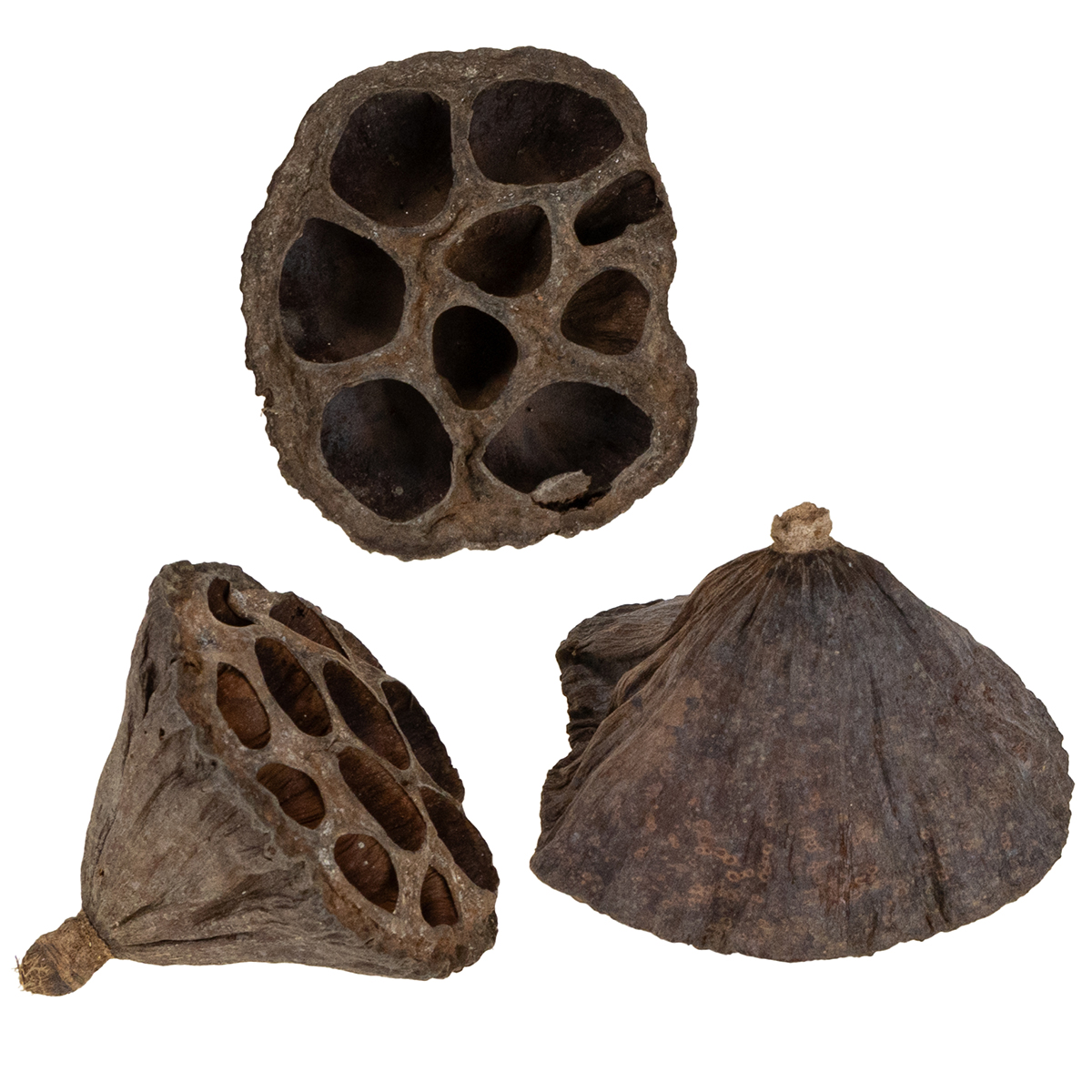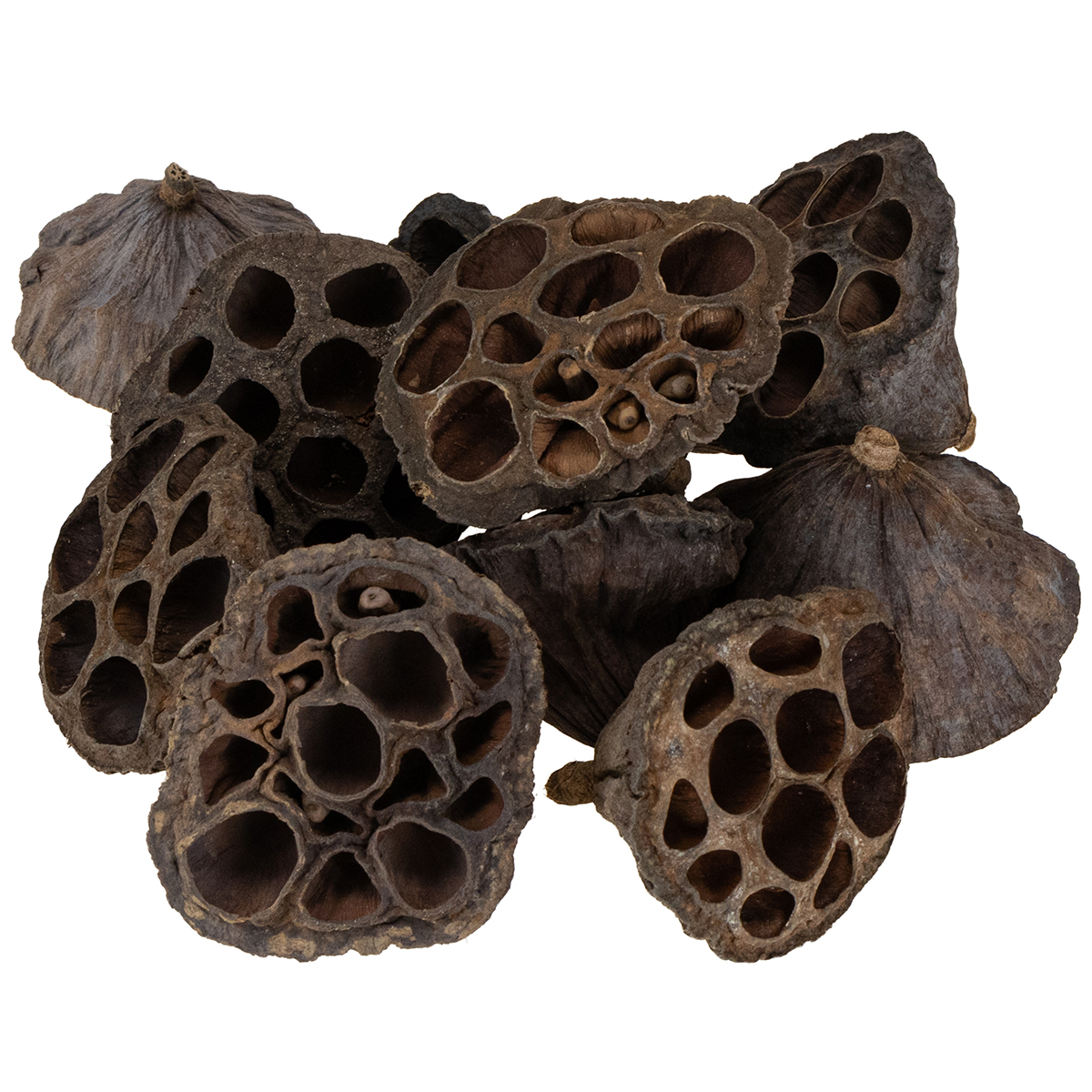 De konisk formede lotus-kolber er blevet tørret, men nogle indeholder stadig frøene og er i alt 100 stykker i en plastikpose. Da dette er naturlige produkter, kan størrelserne variere. Kapslerne er cirka mellem 3,5 og 7 centimeter lange og har hver en diameter på 3 til 6 centimeter.