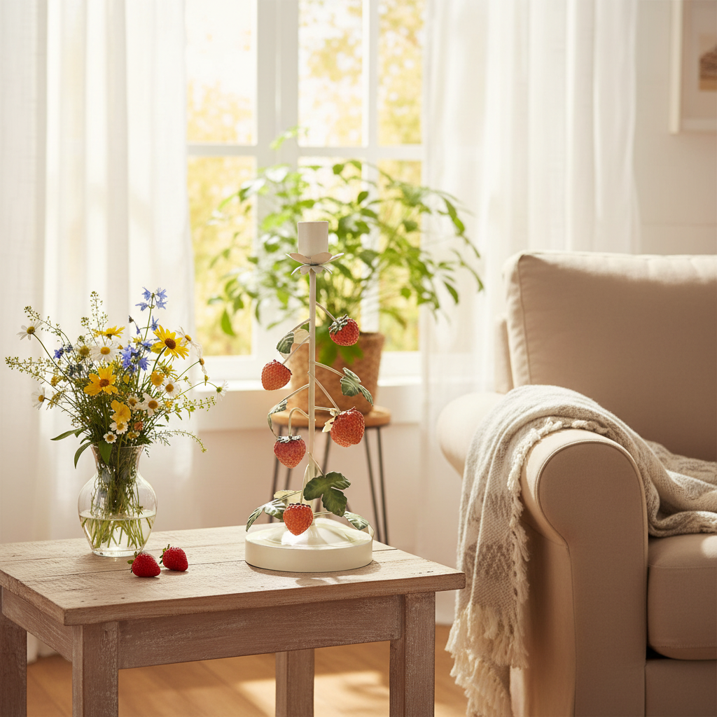 Eksklusiv metal lysestage med jordbærdekoration – ideel til din sommerdekoration