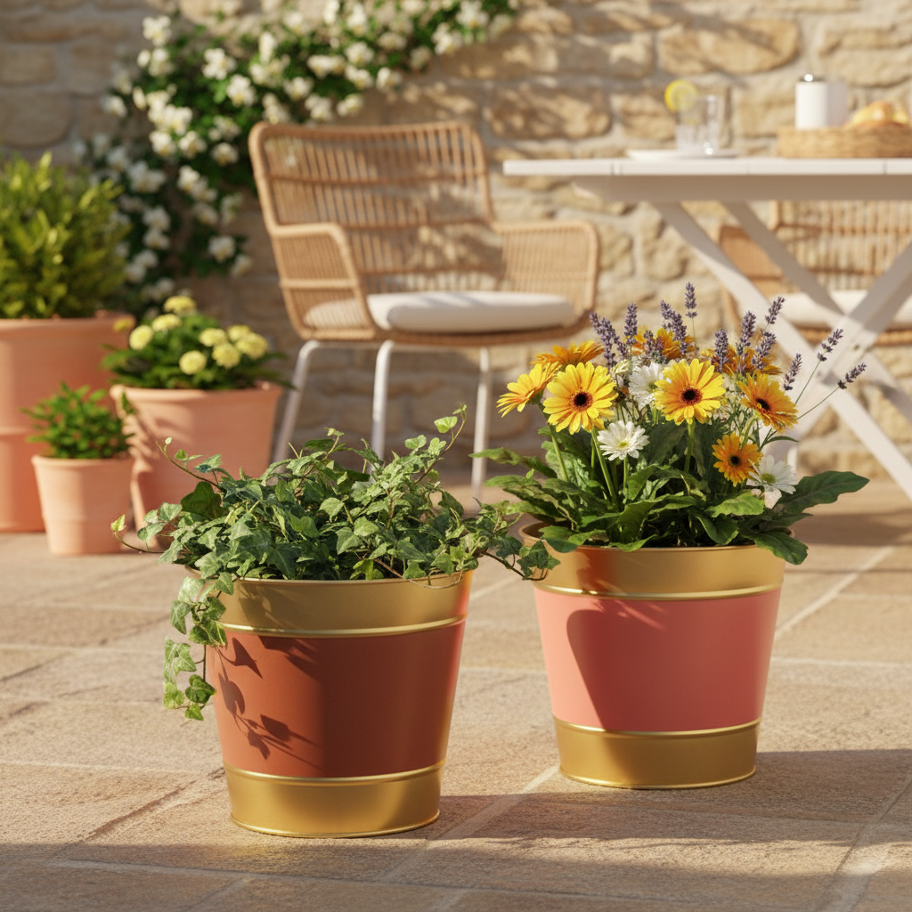Dette sæt med fire urtepotter med guldkant og det flotte farveskema vil inspirere dig. Metalurtepotterne kommer i de trendy farver brun, beige, pink og fersken.