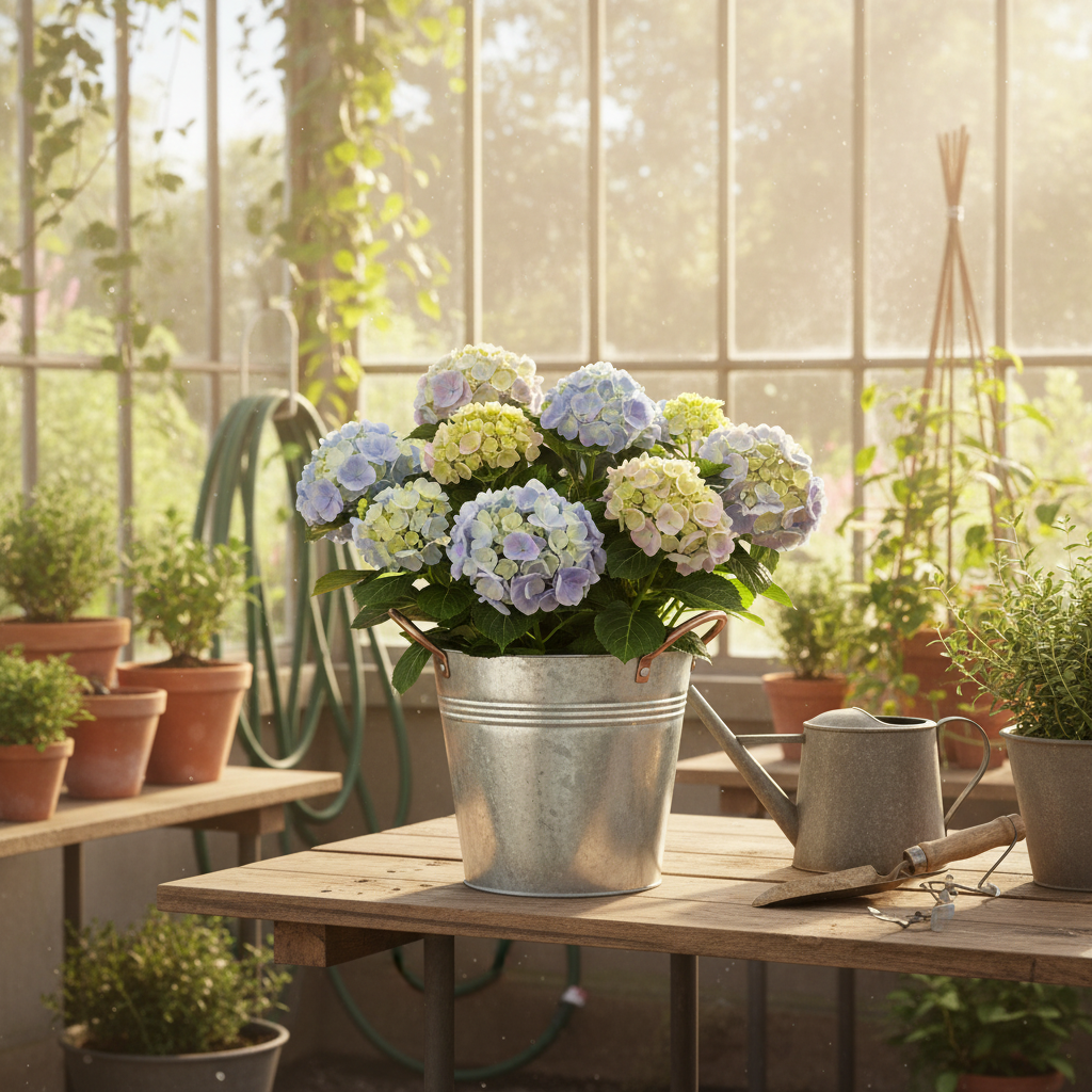 De kobberfarvede håndtag på denne lille metalspand skaber en spændende visuel kontrast til den sølvfarvede dekorative spand. Den galvaniserede overflade giver endda plantekassen et lidt nostalgisk look. Før plantning er det tilrådeligt at fore metalbeholderen med folie for at sikre, at spanden er beskyttet mod korrosion.