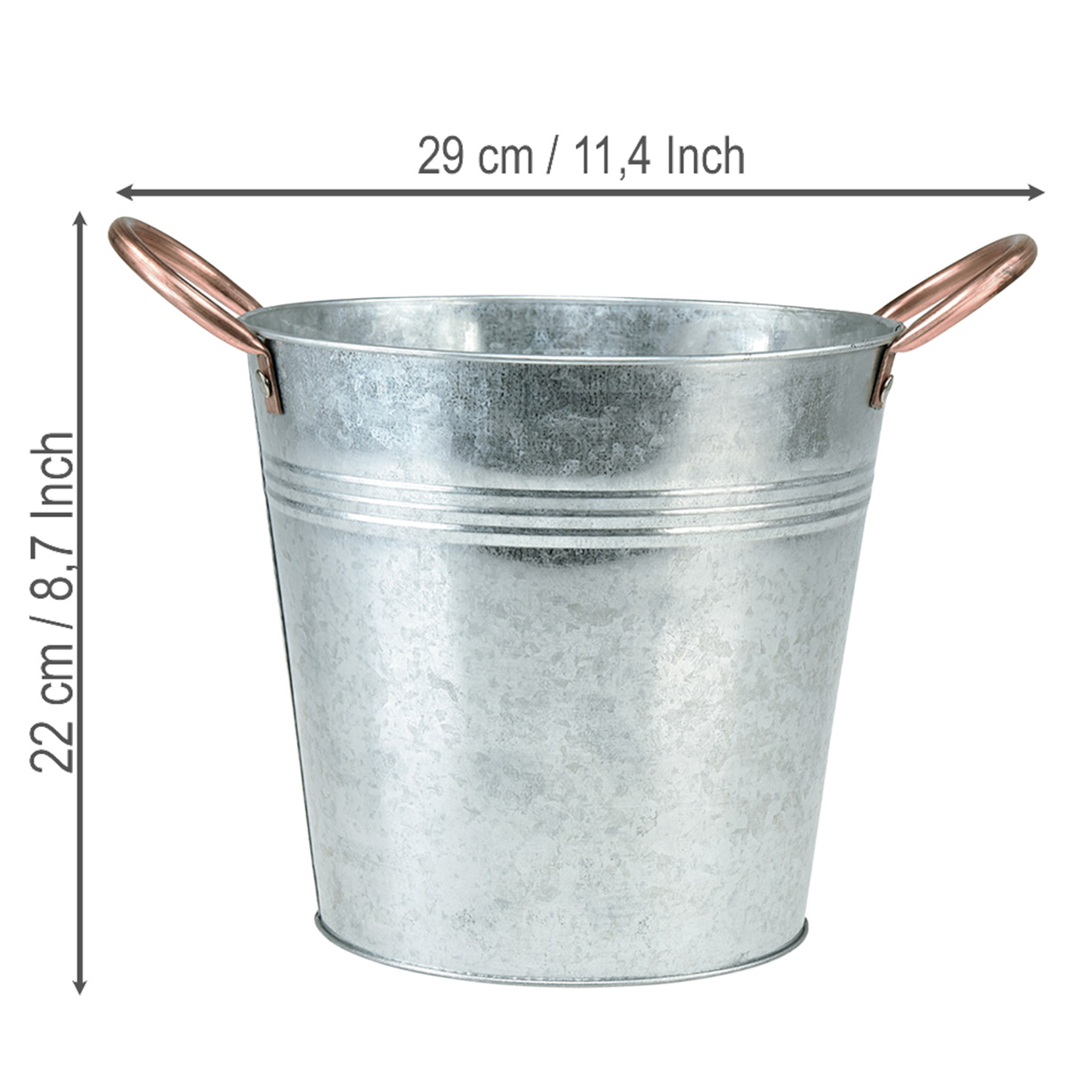 En fængslende kontrast mellem forskellige metaller skabes af de kobberfarvede håndtag på denne metalspand. Den galvaniserede, skinnende sølvoverflade giver plantekassen et subtilt vintage-look. Før plantning er det tilrådeligt at fore metalbeholderen med folie for at forhindre rust og korrosion.