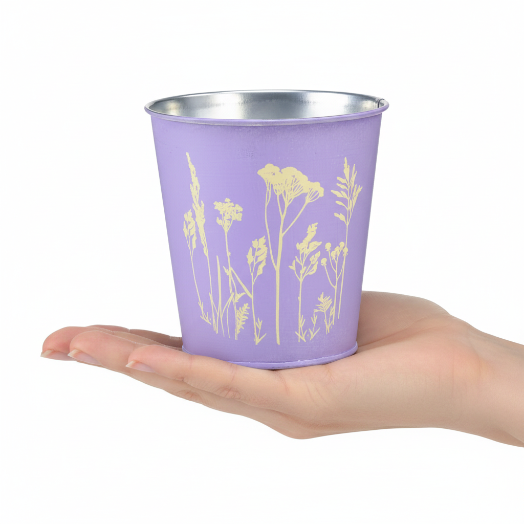 Stil en urtepotte i metalpotten og giv tusindfryd og andre engblomster et nyt hjem med urtepotten. Metalpotten er på den ene side dekoreret med blomstermotivet i gult, hvilket får farven på den lavendelfarvede potte til at glitre som en mat gyldengul.