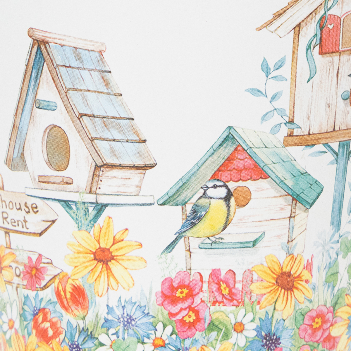 Denne blikspand er dækket af en trykt film, der viser et farverigt hav af blomster med tre forskellige redekasser - et par fugle kan også ses.