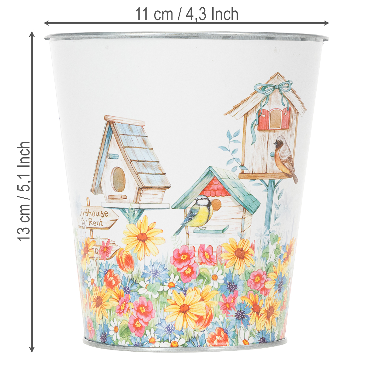 Metalpotte med motiv, plantekasse med fuglehuse, blikspand H13cm Ø11,5cm