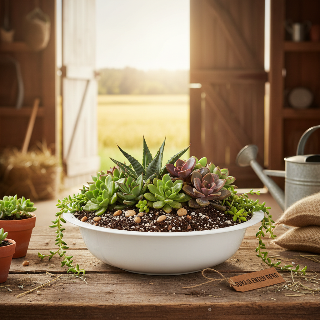 Dekorationsskålen er ikke kun velegnet til udplantning (det er bedst at dække blomsterskålen med folie), men også til bordopstilling, som du gerne vil give et lidt rustikt præg.