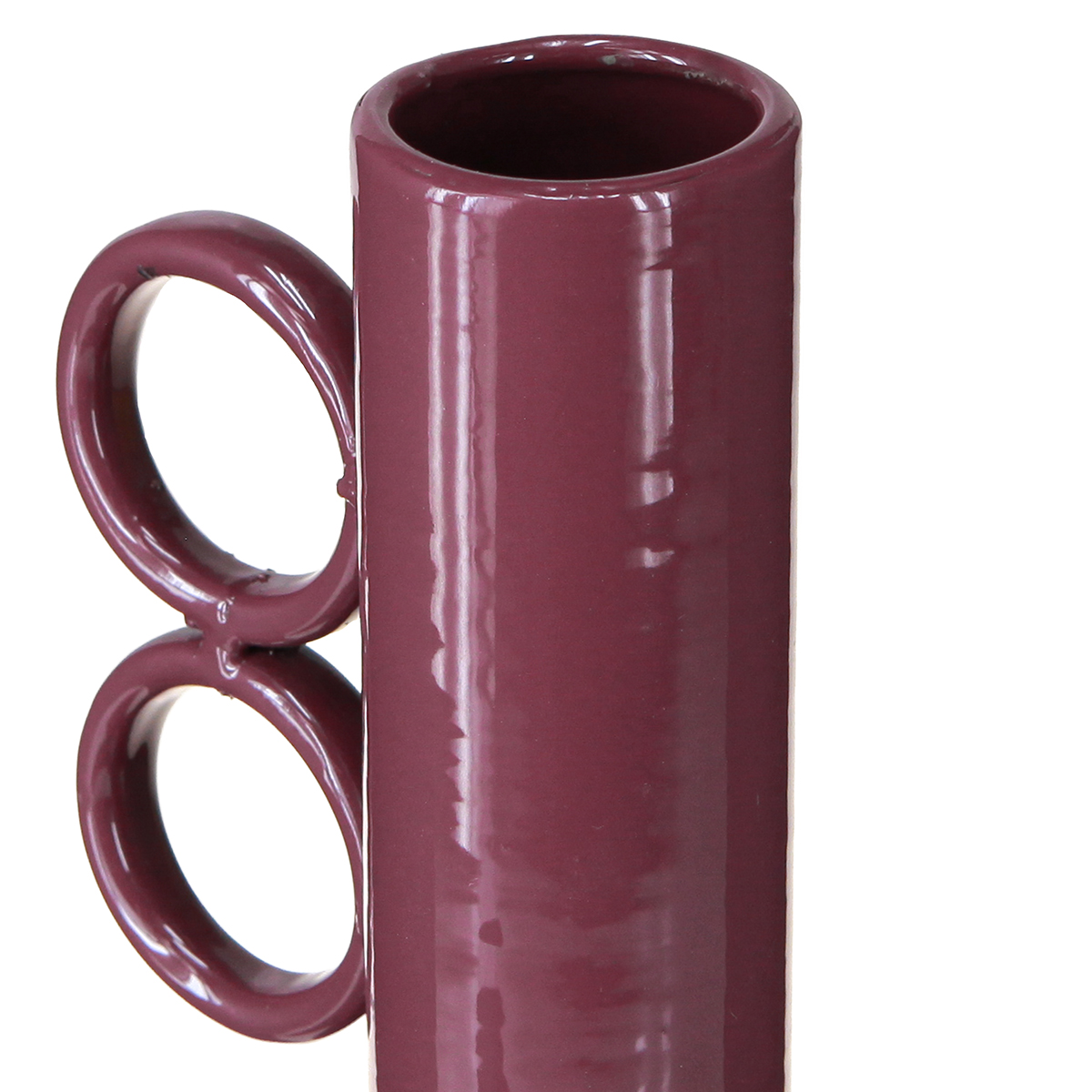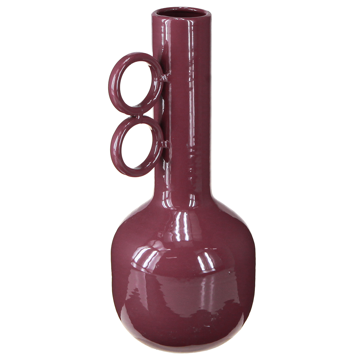 Denne vase imponerer med sit sofistikerede samspil mellem form og funktion. Dens slanke, lange hals giver den en vis ynde og gør den ideel til stilfuld fremvisning af blomster med lange stilke. De runde hanke – et sandt blikfang – er ikke kun dekorative, men understreger også møbelets moderne karakter. Vasen er fremstillet af massivt metal og scorer ikke kun visuelt point, men også for sin holdbare kvalitet. Den blanke røde finish giver den et luksuriøst præg og gør den til et iøjnefaldende blikfang i ethvert rum.