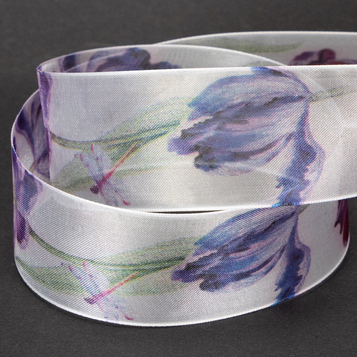 Organzabånd, chiffonbånd, papegøjetulipaner, lilla, 40 mm, 18 m