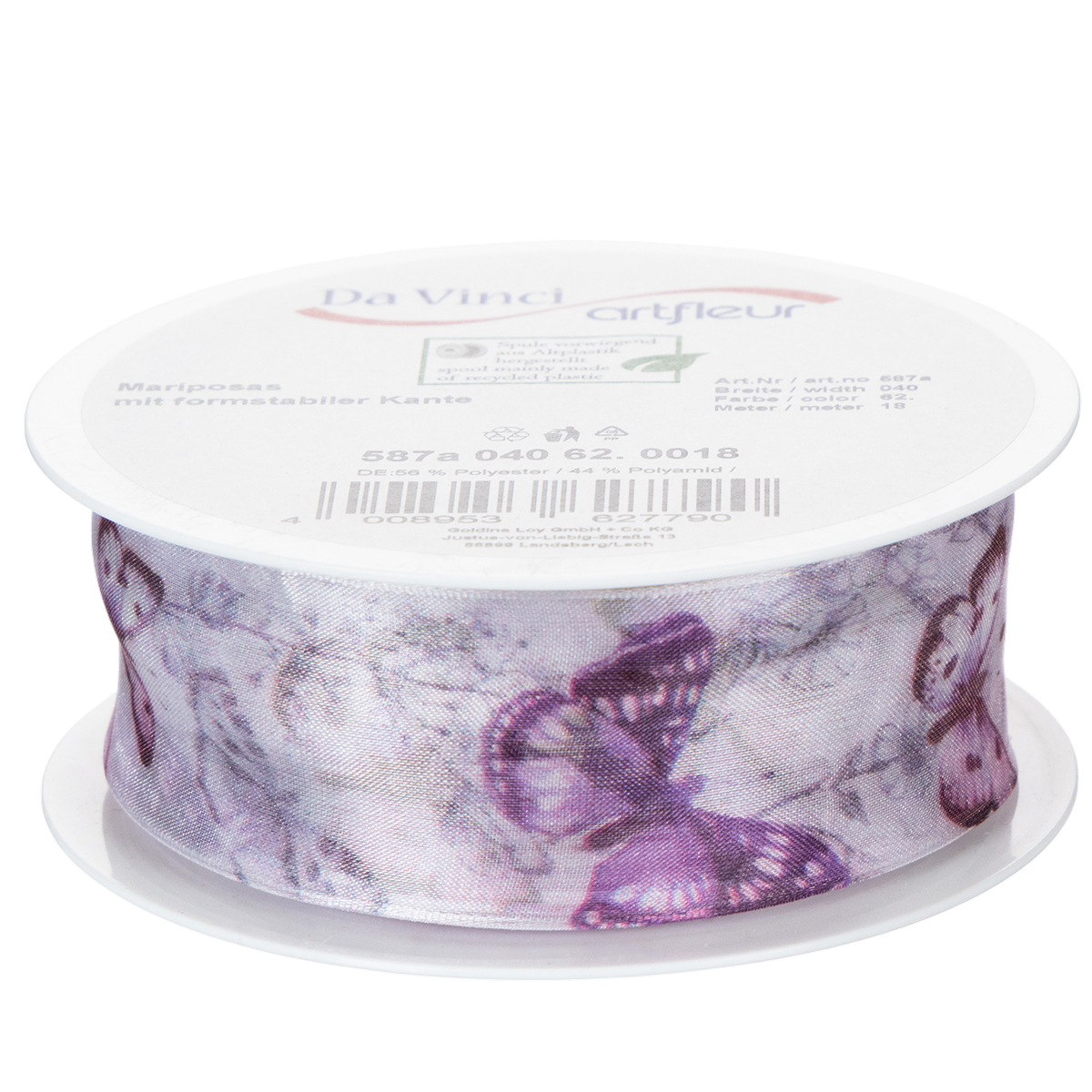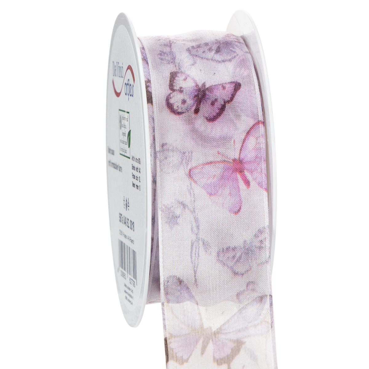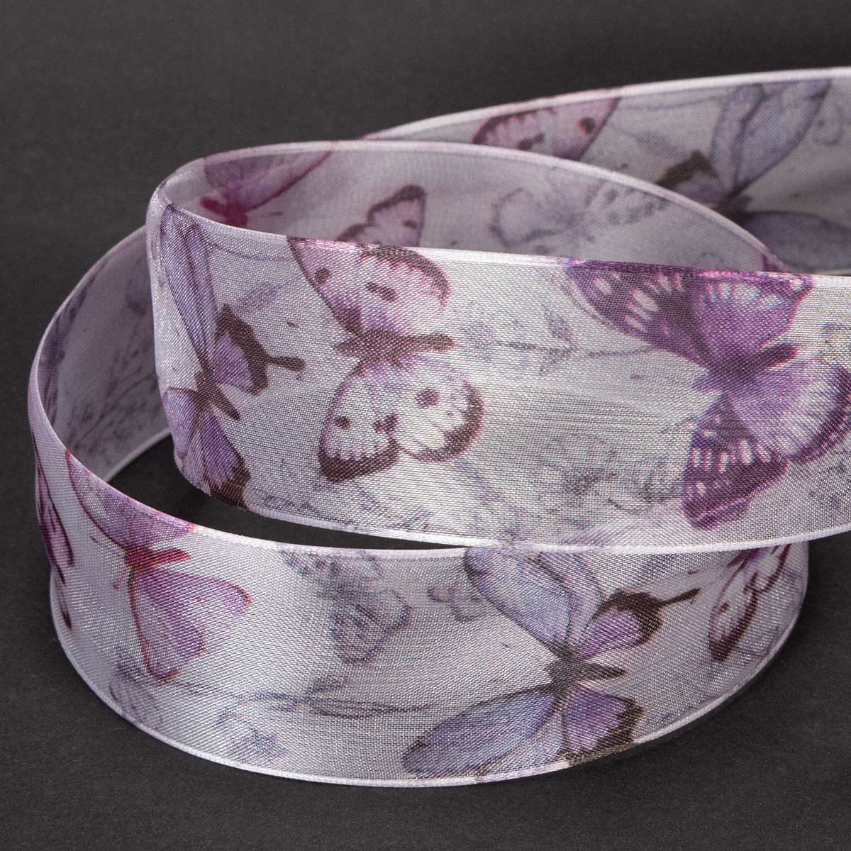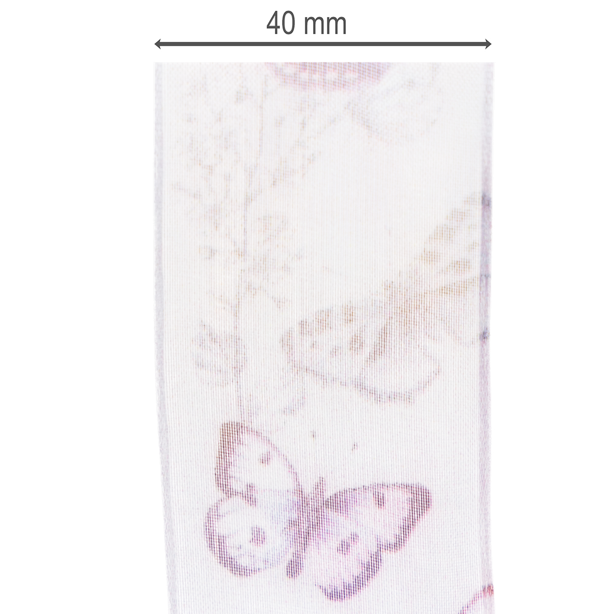 De meget detaljerede afbildede sommerfugle tilhører forskellige, eksotiske og særligt smukke arter, hvilket får motivet til at fremstå meget sofistikeret. Det brede chiffonbånd har et delikat og let look takket være det gennemsigtige organzastof, mens kanten sørger for, at sløjfer bevarer deres form.