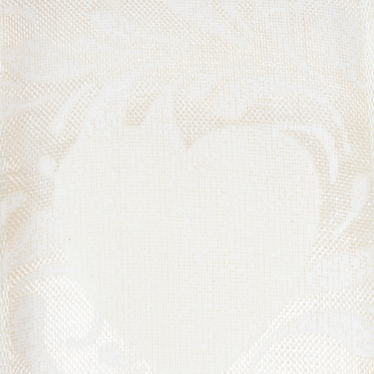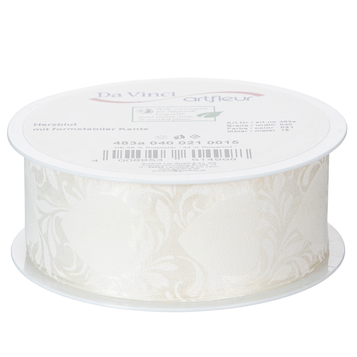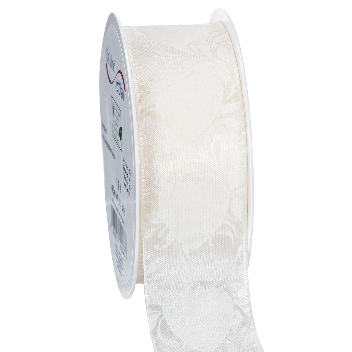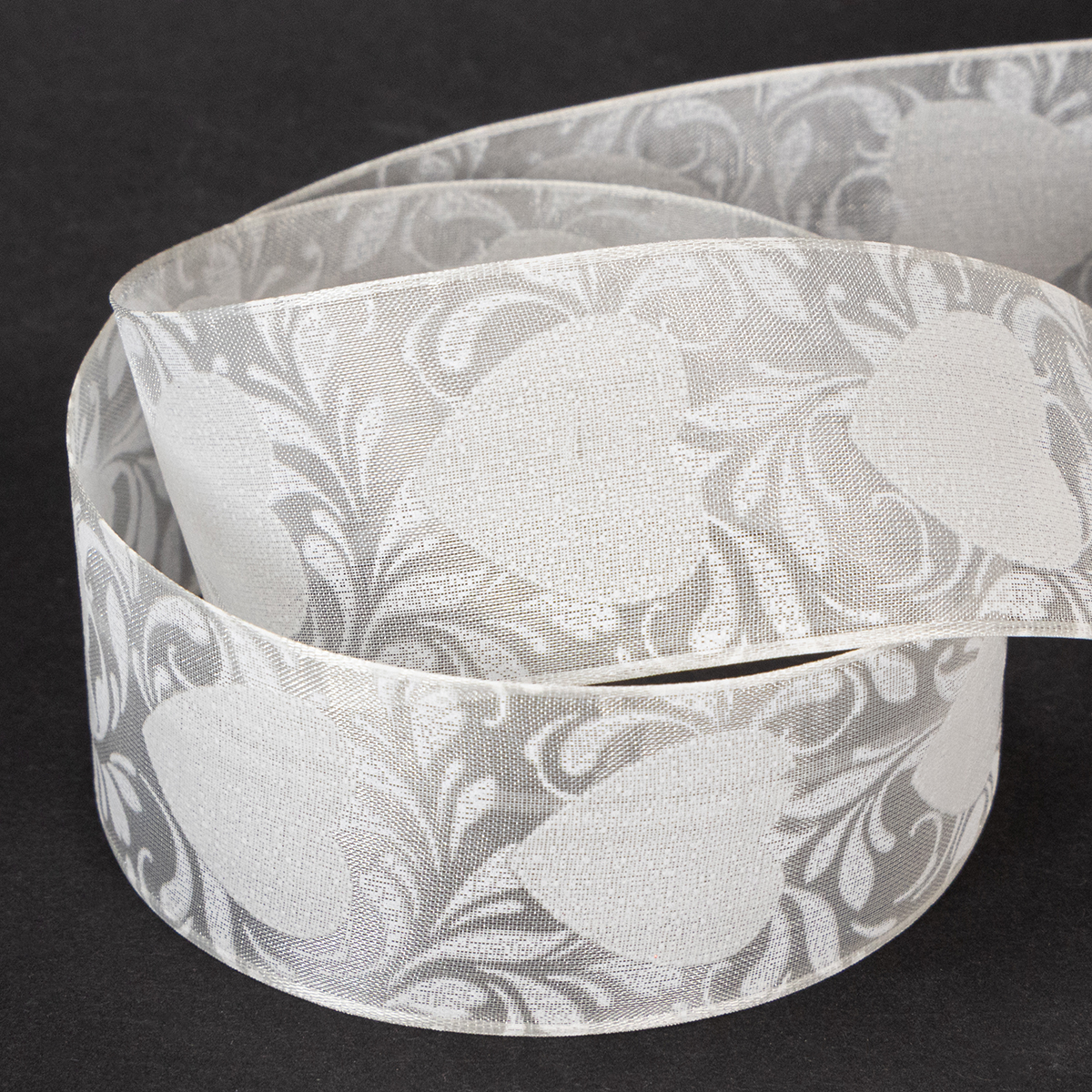 De sarte hjerter er omgivet af bladrige grene som blomster og trykt på det gennemsigtige organzastof, hvilket giver båndet et sofistikeret look, der minder om blonder. Dekorationsbåndets varme cremefarvede tone er tidløs og formidler samtidig en vis nostalgi.