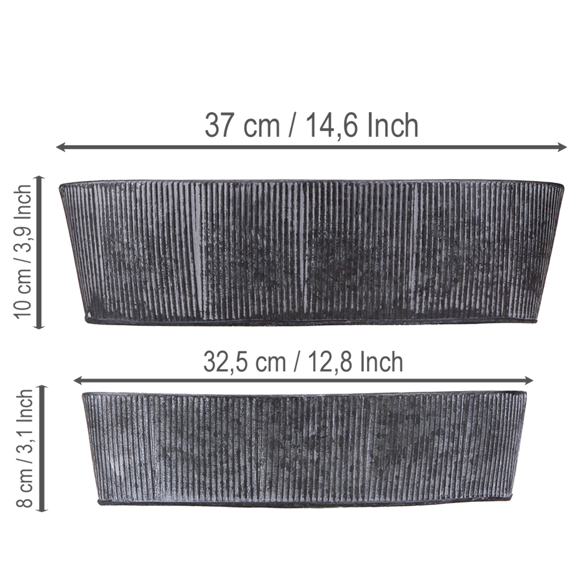 Den ovale skål lavet af metal og sort kombinerer stilfuld elegance med en charmerende vintage æstetik, der vil forbedre dit hjem. Hvad enten det er som en iøjnefaldende dekorativ skål, som en nostalgisk borddekoration eller som en rustik blomsterskål – dette sæt med to stabelbare metalskåle åbner op for adskillige kreative muligheder. Det elegante farveskema i sort, vasket gråt samt det fine rilledesign harmonerer perfekt med enhver shabby chic eller industriel stil. Brug skålene som planteskåle og tilføj et grønt highlight med stueplanter eller krydderurter. Den mindre er perfekt til stilfuld nøgleopbevaring eller til sukkulenter.