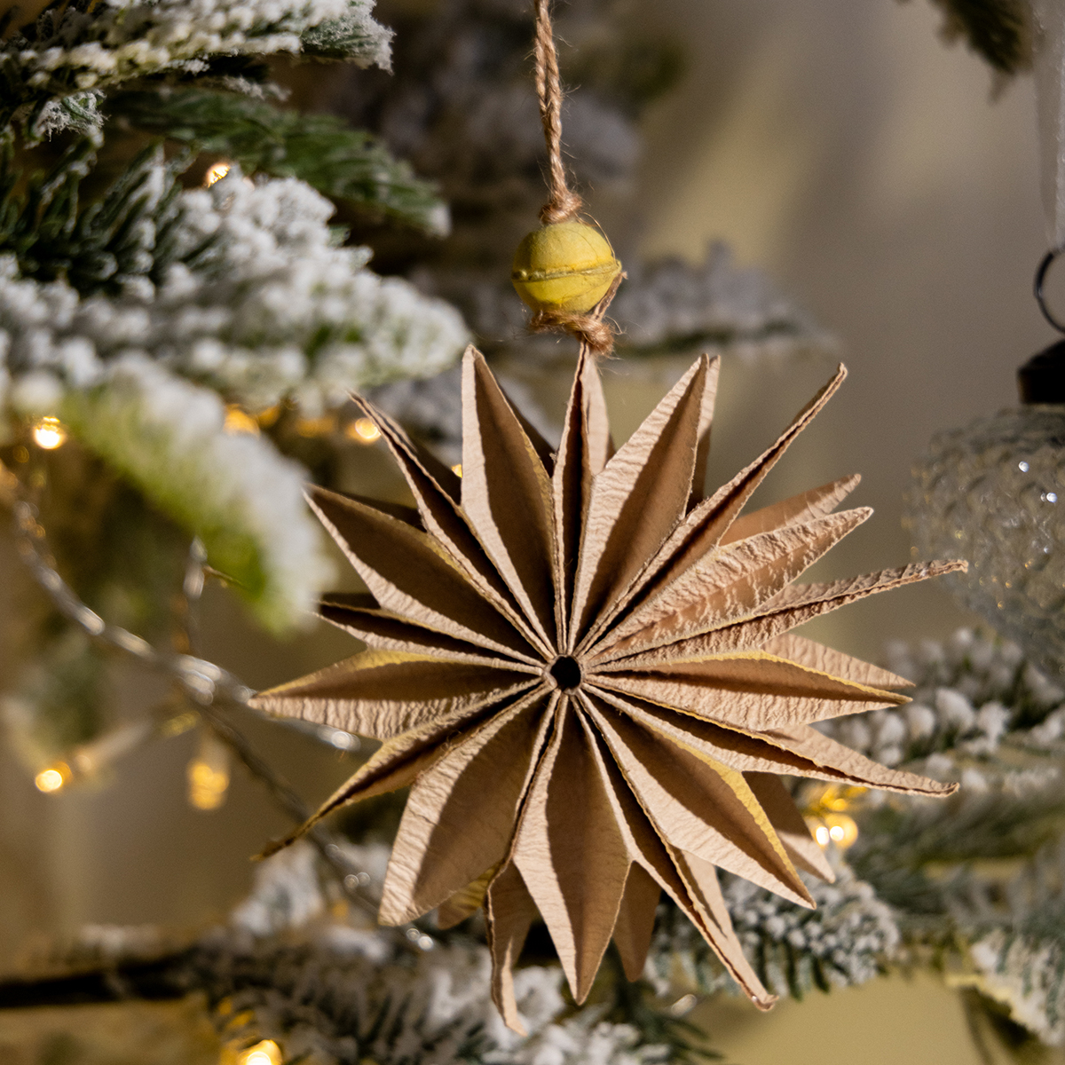 Disse naturlige brune papirstjerner tilbyder diskret elegance – perfekte til dem, der elsker naturlige materialer og en afslappet atmosfære. Uanset om de bruges som vinduespynt, juletræspynt eller dørkranse, er disse papirstjerner alsidige. Med en diameter på cirka 10 cm og en charmerende gul polystyrenperle tilføjer disse ornamenter et stilfuldt touch.