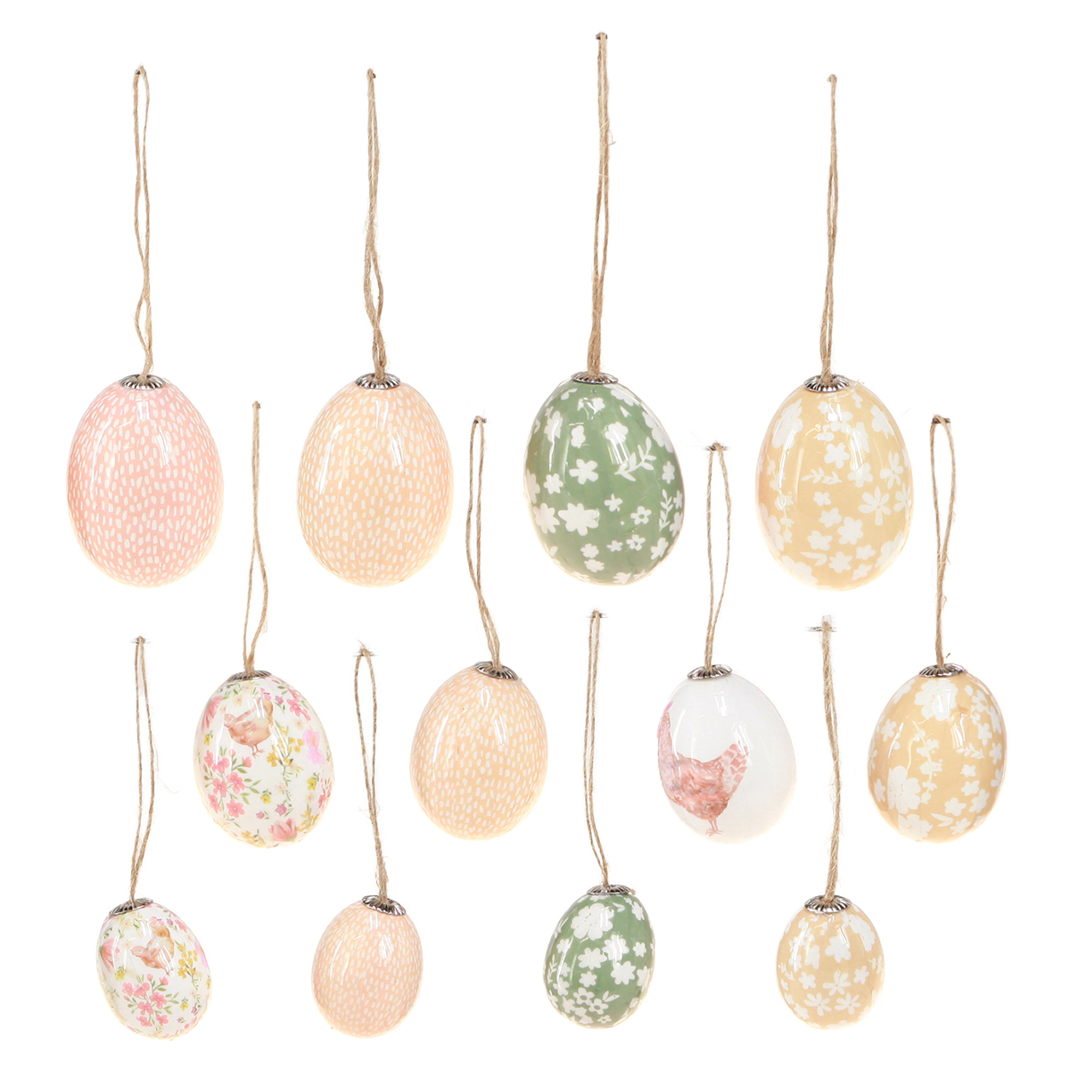 Vores plastik påskeæg i de friske farver hvid, grøn og brun er den perfekte påskepynt til dit hjem. Disse magiske plastikæg er ikke kun visuelt iøjnefaldende, men også ekstremt praktiske at bruge. Hvert æg er lavet af en gennemsigtig plastikskal og har farvet papir i grønt og brunt indeni. Designet suppleres af lejlighedsvise kyllingemotiver, der understreger den landlige charme. De små metaløjer og jutesløjfer gør det nemt at hænge æggene, hvad enten det er på påskebuketten i stuen, på påskekransen på døren eller på påskebusken på altanen. De to poser indeholder hver 12 plastæg i forskellige størrelser (3,5-5,5 cm), som sikrer et varieret og kreativt design. Kombinationen af klassiske påskesymboler og moderne materialer gør denne påskedekoration til en farverig borddekoration eller et attraktivt altandesign om foråret.