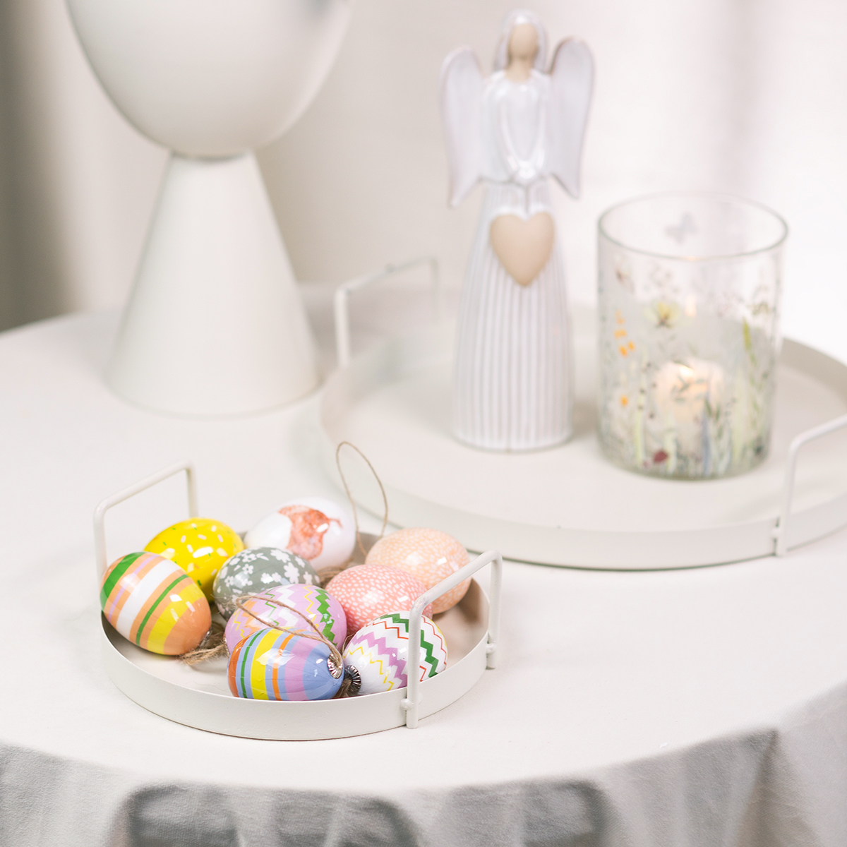 Disse charmerende påskeægsfigurer er både praktiske og stilfulde. Hver af de tolv miniaturer er kærligt dekoreret med delikate mønstre og imponerer med den tidløse karakter af deres farver og designs. Deres praktiske størrelse på 6 cm er ideel til en bred vifte af dekorationsideer. Takket være det robuste plastmateriale er ornamenterne holdbare og langtidsholdbare – velegnede til både indendørs og overdækket udendørs brug.
