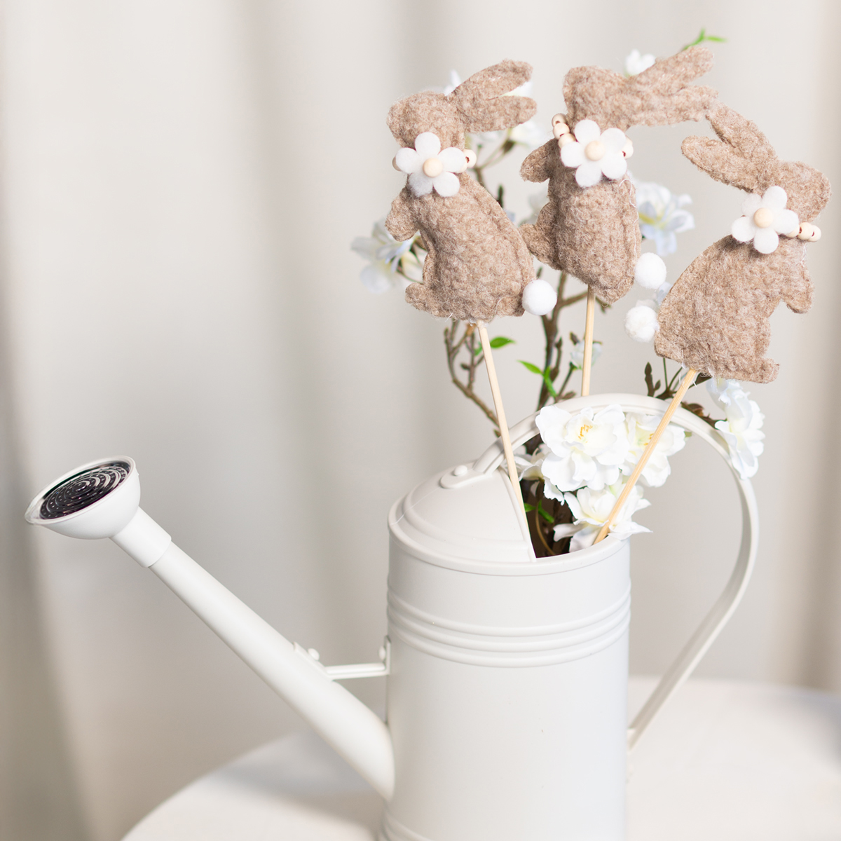 Denne påskeharedekoration er et sandt højdepunkt for kreative dekorationsentusiaster. Figurerne er lavet af filt af høj kvalitet i en varm brun tone, der udstråler naturlighed og hygge. De charmerende detaljer, såsom den fine blomst og den lille fluffy hale, giver kaninerne et særligt præg. Den robuste pind gør det nemt at arrangere kaninerne i vaser, plantede potter eller blomsterarrangementer. De, der foretrækker minimalistiske eller skandinaviske designs, vil elske den underspillede, men udtryksfulde stil på disse figurer.