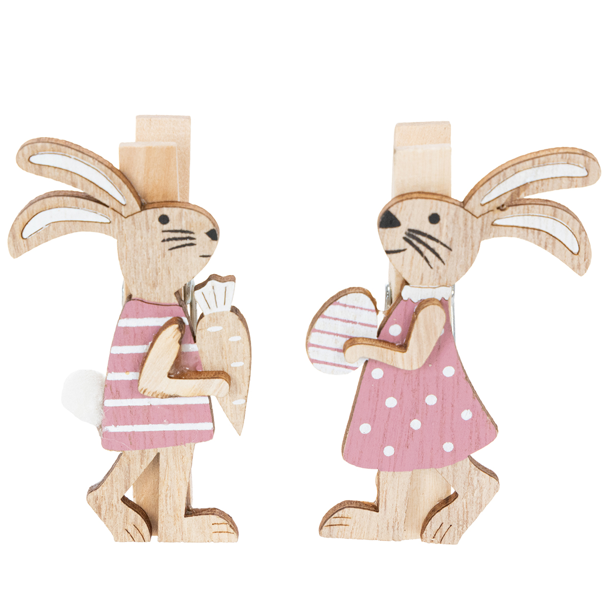 Træklips fra dekorativt mærke Viana er smukt designet: kærligt malet, en fastgjort arm for mere plads, en hvid blød hale og et æg eller en gulerod - så mange detaljer, der gør disse klip til et dekorativt tilbehør af ekstrem høj kvalitet. Bortset fra metalfjederen er de udelukkende lavet af træ og ekstremt praktiske!