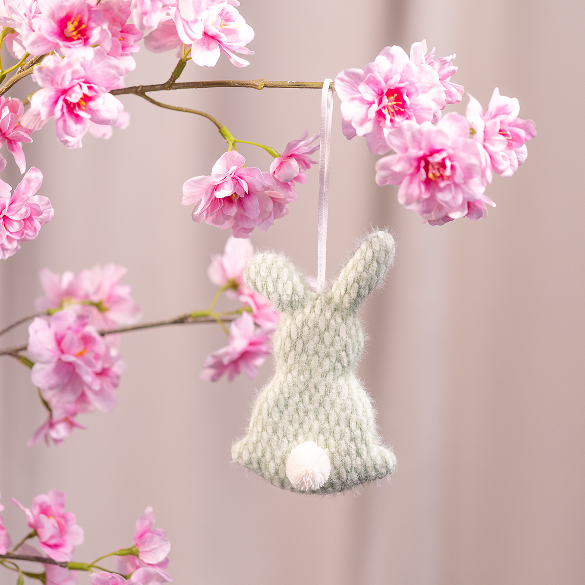 - Hæng kaninerne på en dekorativ påskegren med blomstrende kviste.