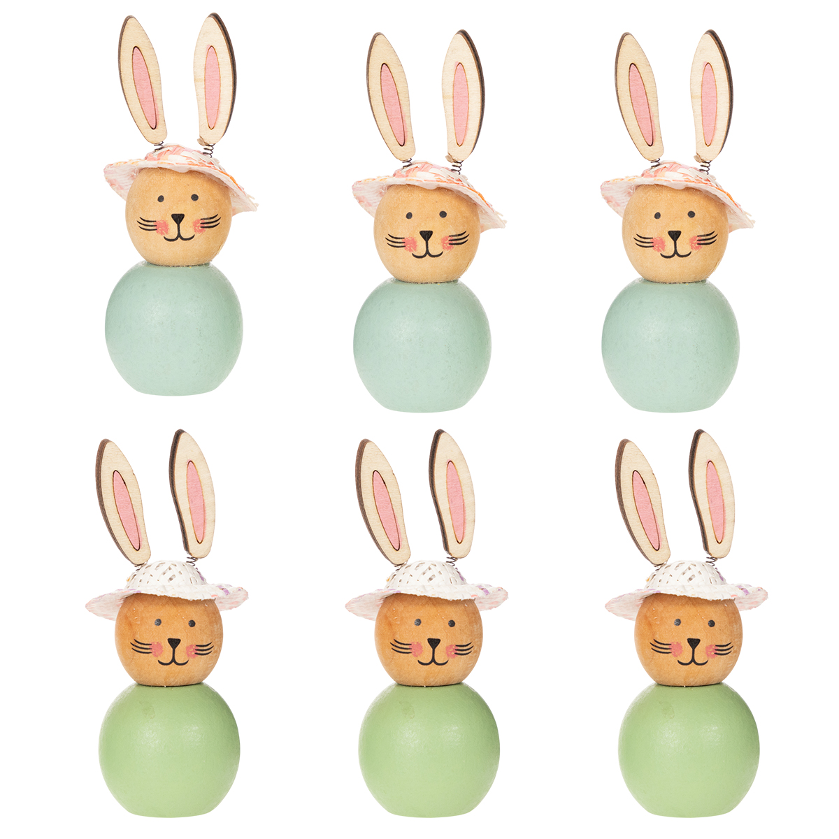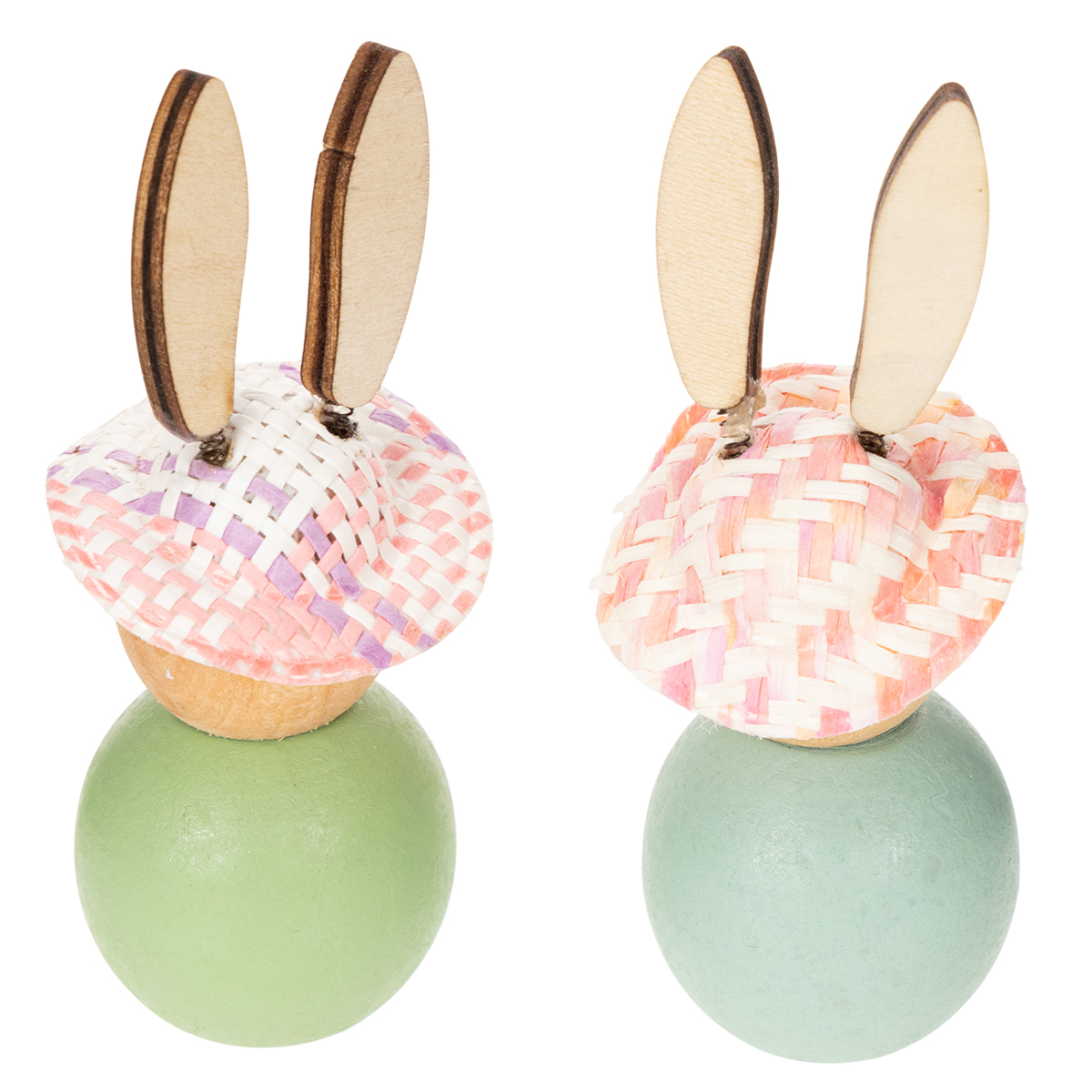 Disse træfigurer imponerer med deres naturlige charme og muntre appel: klart træ kombineret med diskrete nuancer af grønt og mintgrønt møder et legende design. Især de lyserøde hatte giver figurerne et stilfuldt vintage-præg. Hver kanin er cirka 9 cm høj og bringer et strejf af forår ind i dit hjem. Ørerne på metalfjedre er ikke kun visuelt slående, men tilføjer også en livlig detalje, der helt sikkert vil fange øjet.