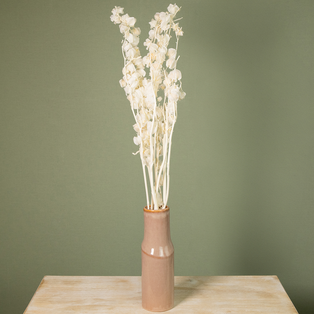 Vores tørrede, blegede kinesiske lanterneblomster består af 75-80 cm lange, omhyggeligt konserverede stilke, prydet med den karakteristiske, lille, lanternelignende physalis. Takket være deres enkle hvide farve kan disse tørrede blomster integreres perfekt i en bred vifte af indretningskoncepter. De giver ethvert rum en delikat elegance uden at være påtrængende – et højdepunkt, der kombinerer enkel skønhed med en forbindelse til naturen.