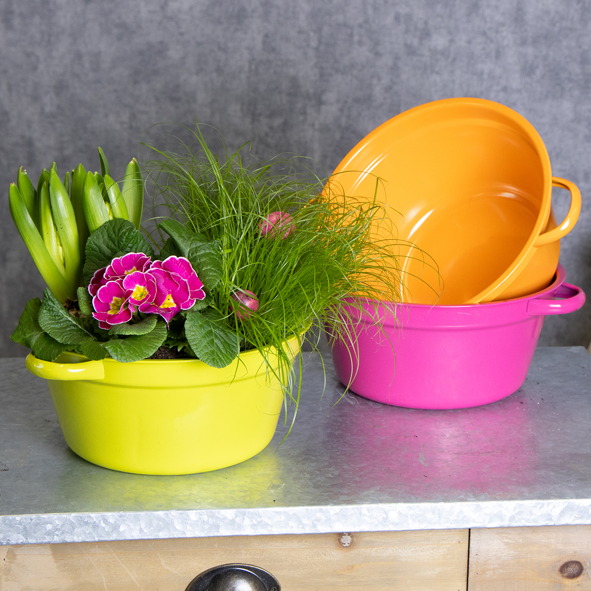 Vores metalplantekasser kombinerer charmerende funktion og stil. De udstråler grøn, orange og pink – en trio, der øjeblikkeligt lyser dit humør op. Med en diameter på 25 cm og praktiske håndtag er de nemme at flytte og perfekte til en række forskellige arrangementer. Uanset om det er til din stue, vindueskarmen eller altanen: disse plantekasser gør det nemt at skabe din egen lille urtehave, smukke blomsterarrangementer eller kreative gaveideer. Forestil dig dem dekoreret med farverige forårsblomster, sukkulenter eller friske krydderurter – simpelthen vidunderlige, ikke sandt?